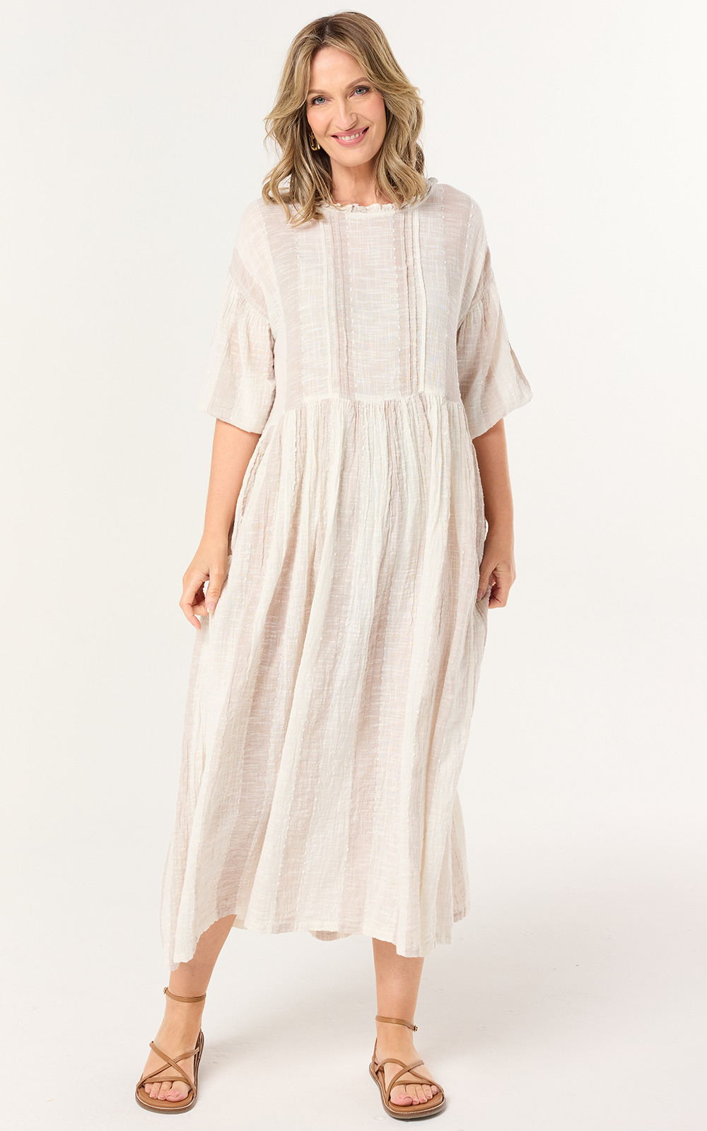 In need of a dress to see you through the transitional seasons? The ‘A New Journey’ dress is here to cover all basis. Crafted in the ‘Stripe Club’ rayon blend, this light weight, subtly textured dress is perfect for throwing on with sneakers for running errands or dress it up with a chic sandal to take you to your evening plans. With its pull-on style and generously tiered skirt this dress will be your go-to when the weather heats up.