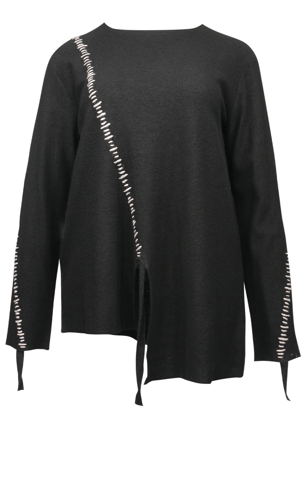 Another knitwear stunner from Moyuru – the Aida Pullover perfectly combines femininity and edginess. Crafted from a soft wool knit, it features a crew neckline with a dropped shoulder, extended arms and a straighter silhouette. The finishing touches include contrast blanket stitching throughout, an asymmetric hemline and tabs at the sleeves and front hemline. This is the ideal jumper to layer while adding some shape to your look; perfect over tunics and shirts or Moyuru’s Utagawa Pullover, pairing simply with relaxed cropped pants and ankle boots. A timeless beauty. *General fit – M = 14-16, L = 16-18.