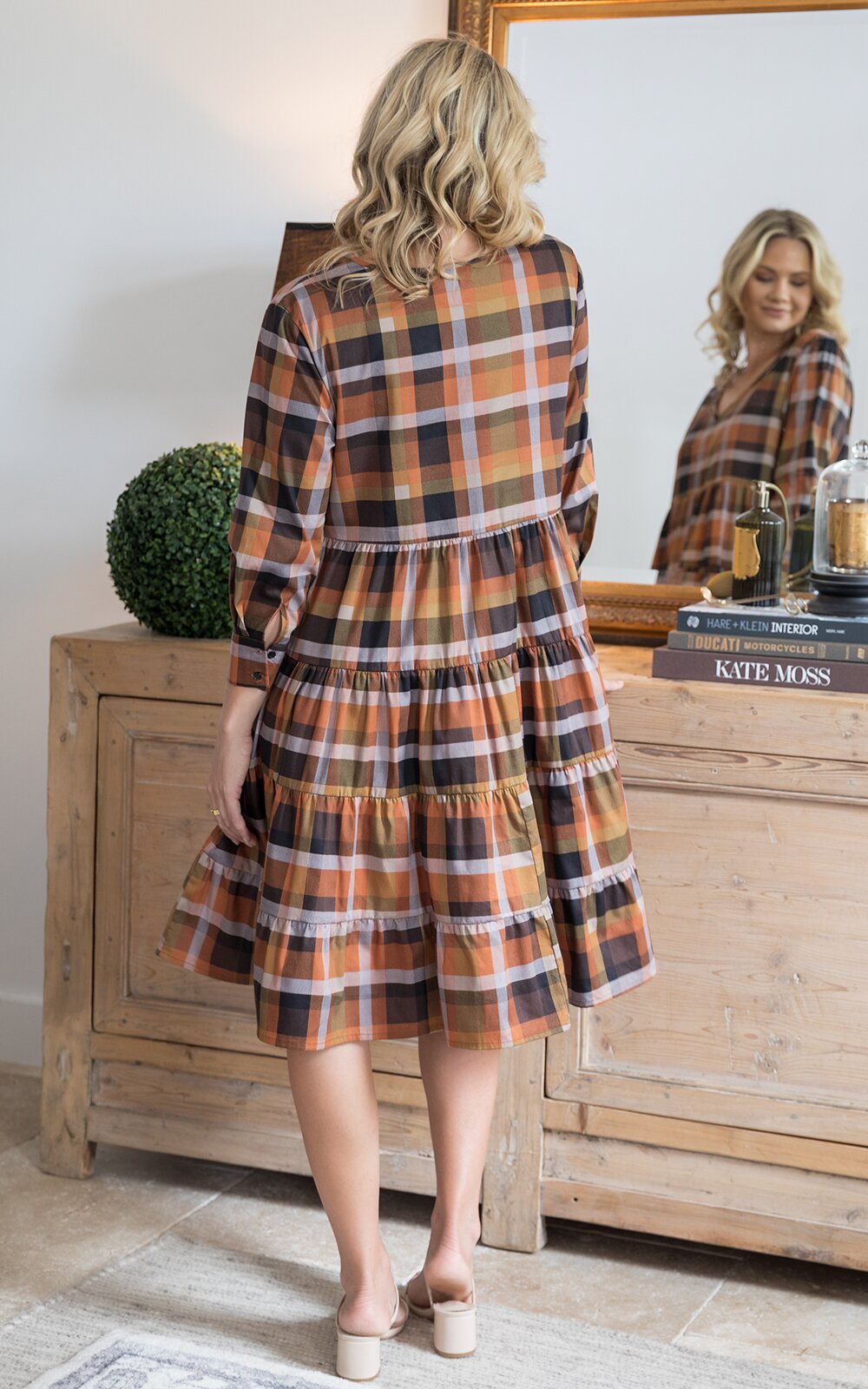 Give your wardrobe an elegant uplift with our new Bonita Dress! The dress comes in our latest Fall Check print that adds an extra layer of chic to the style. The Bonita Dress features a V-neckline, multiple gathered tiered layers, long sleeves with cuffs, and a floaty midi-length skirt. It’s crafted from 100% cotton, making it both comfortable and low maintenance. Simply style with flats, sandals, or sneakers during the day, and for an effortless evening look, pair with heels or boots. The Aldo colourway matches perfectly with neutral accessories.