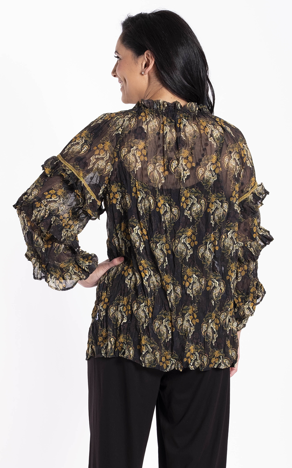 The Arabella Top is a softly structured women’s style designed to be worn on or off the shoulder, offering versatile styling with a relaxed, feminine feel. Featuring gentle volume through the body and long sleeves with gathered cuffs, it creates an effortless silhouette that’s comfortable yet elevated. The soft elasticated neckline allows flexible styling, while the easy pull-on design adds practicality. Shown here in the Twilight Bloom print, the rich floral pattern brings depth and drama to the piece. Designed in New Zealand for real women, the Arabella Top is a statement style that can be worn casually or dressed up with ease.