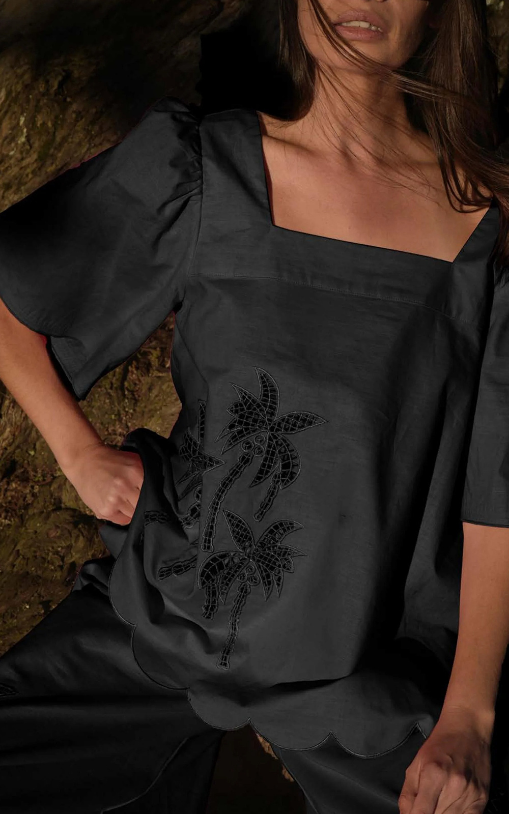 With endless styling opportunities the ‘Behind Her Back’ shirt is a summertime must have. Showcasing a bold seascape design through its ‘Break the Shell’ viscose satin, this blouse sports a generous fit with seamless, batwing styled sleeves that fall to a fixed cuff. Full of movement and colour this shirt makes a statement on its own, or pair this open over your favourite separates as a light-coverage layer.