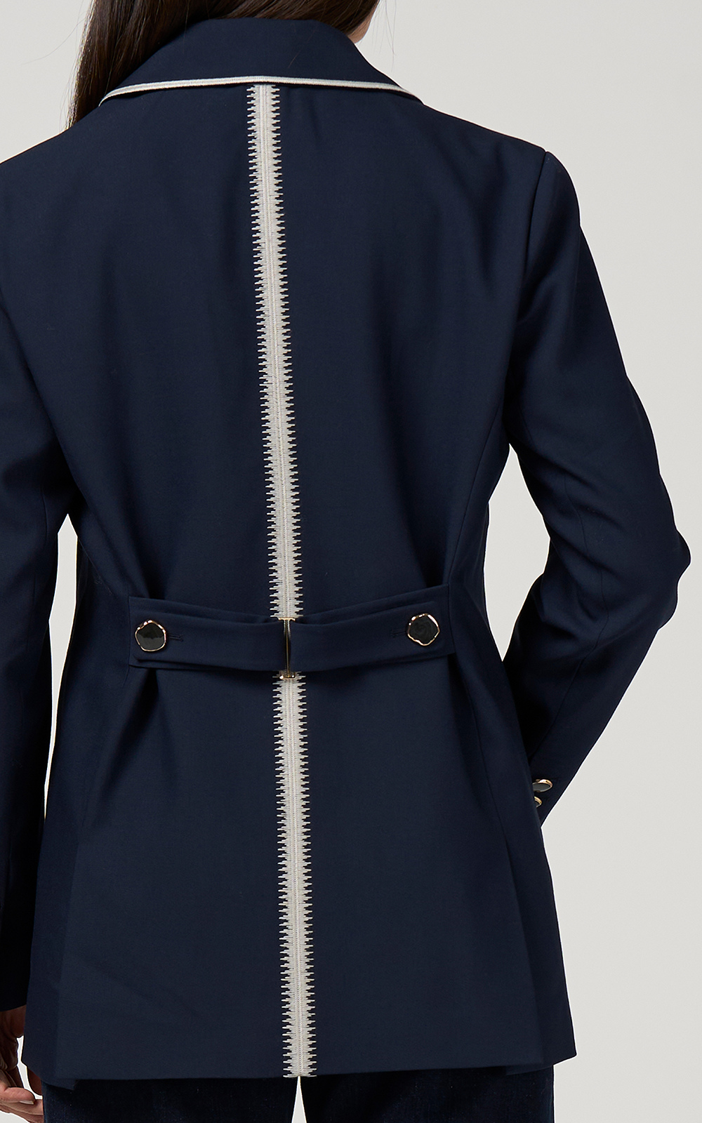Relaxed longline blazer with a single-breasted front, and a sharp peaked collar. Featuring matching embroidery on the collar and pocket flaps for a refined, tailored touch. Finished with a contrast embroidered back waist tie that adjusts for shape.