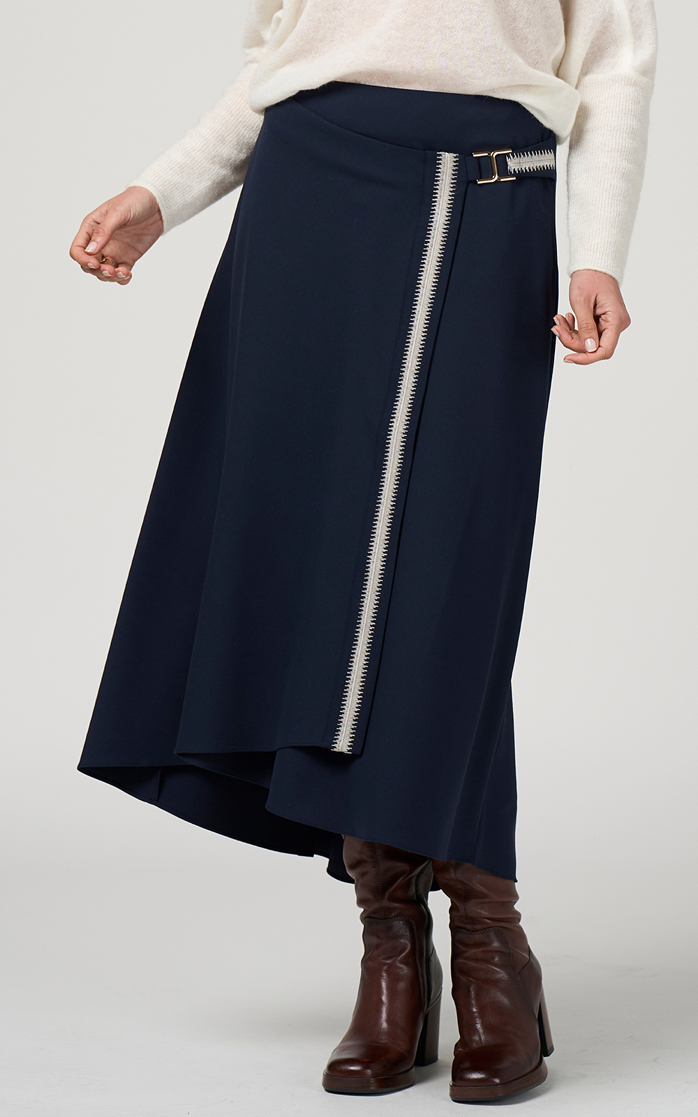 Faux wrap midi skirt featuring a side zip and elasticated back waist for comfort. Bold contrast embroidery detail highlights the front wrap edge and waist tab. Finished with a soft gold metal clasp for a sophisticated touch.