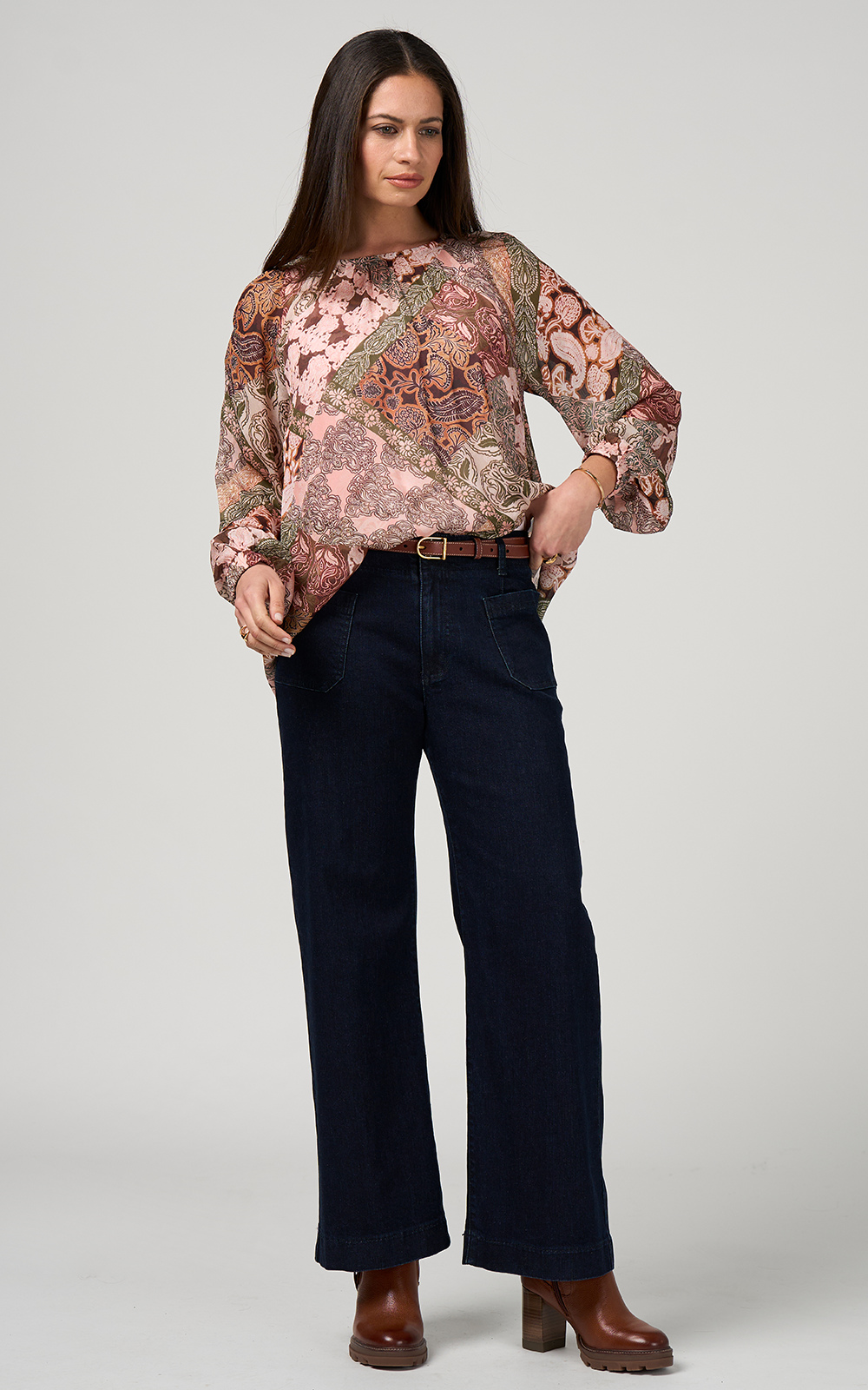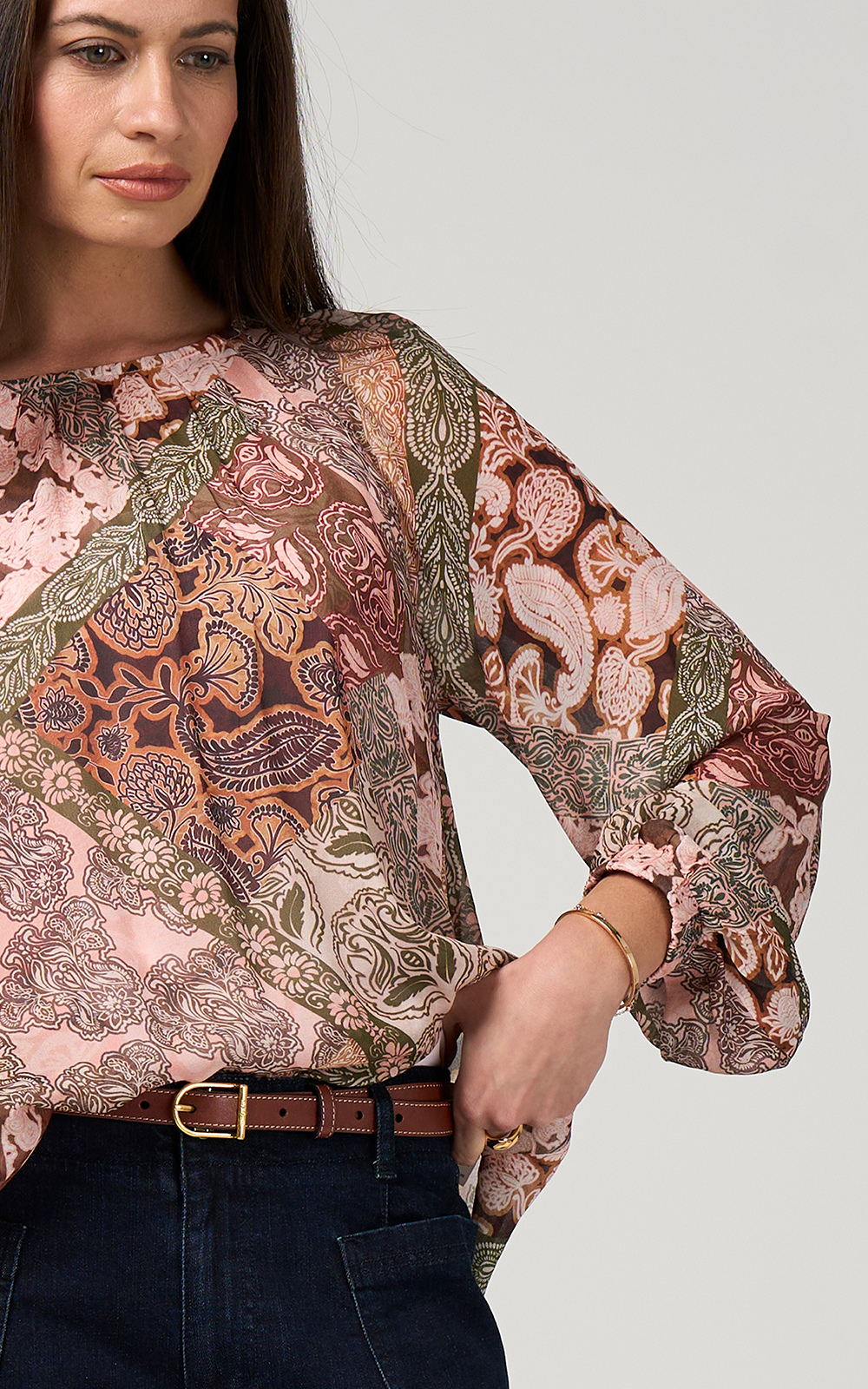 Floaty sheer blouse featuring a round neckline, with blouson sleeves with elastic cuffs. Comes with colour-matched A-line cami.