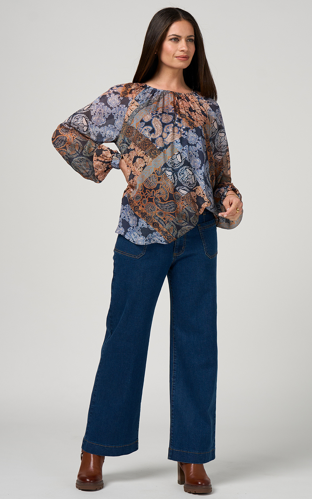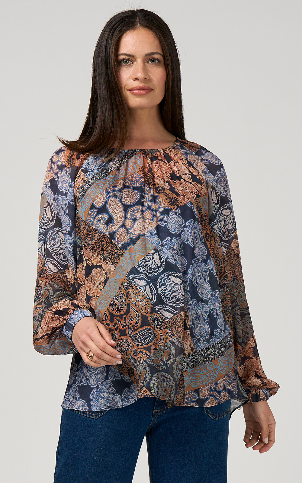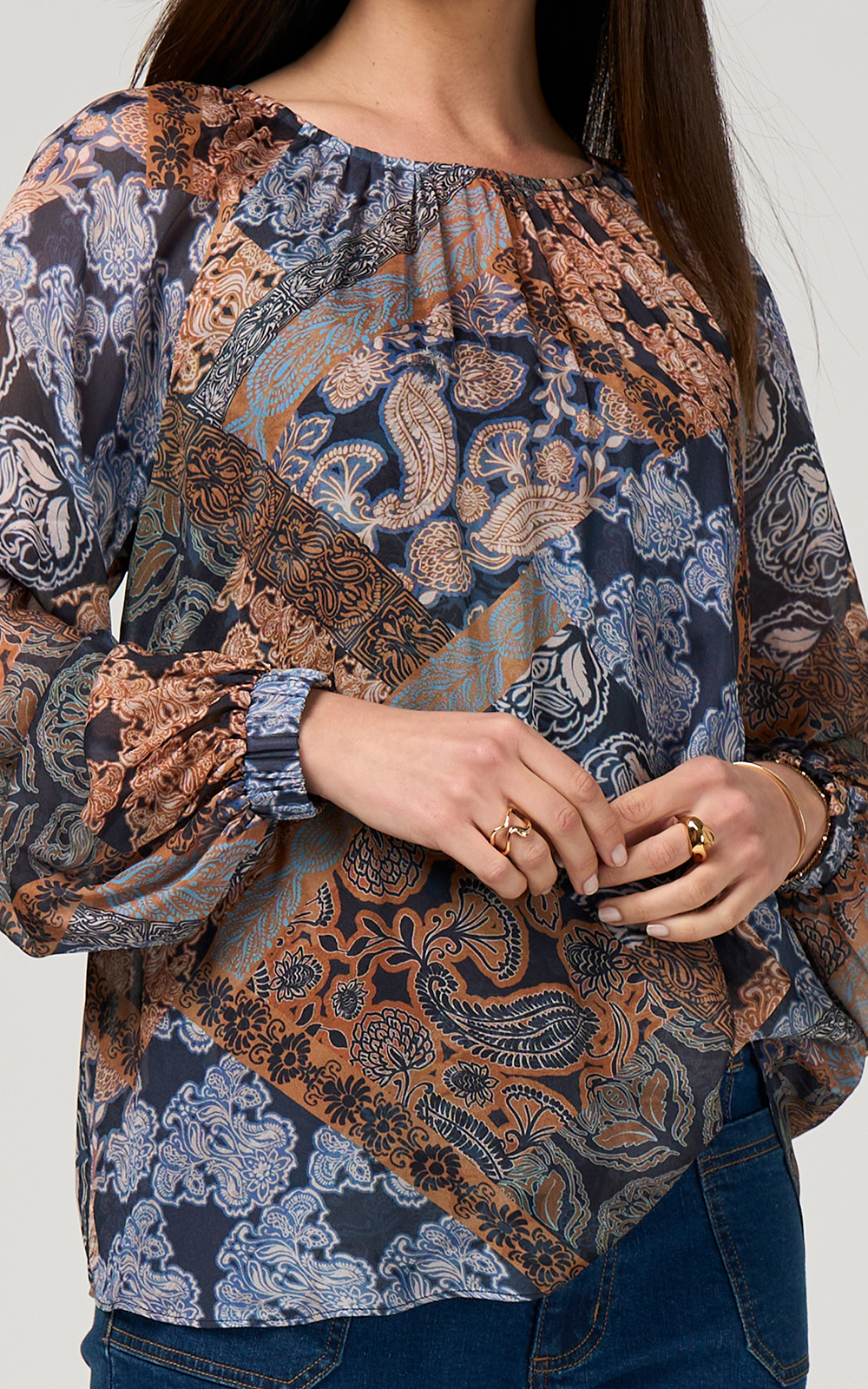 Floaty sheer blouse featuring a round neckline, with blouson sleeves with elastic cuffs. Comes with colour-matched A-line cami.