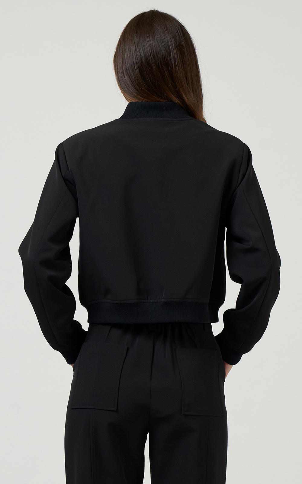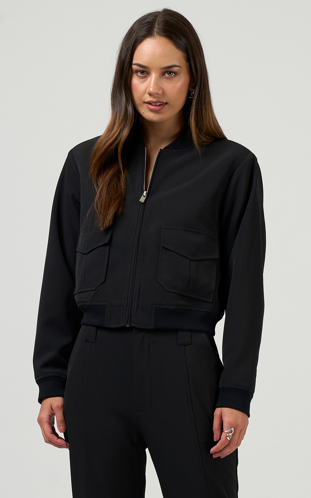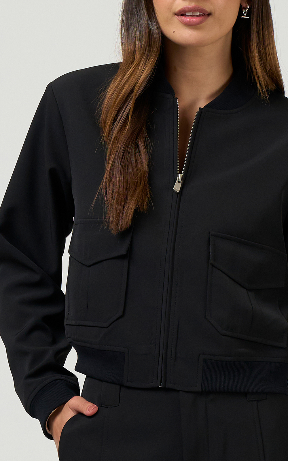 Bomber jacket with a zip front, and front pockets, accessible from the side with top flaps and cutaway corner detail, featuring rib detailing on the neck band, hem and cuffs. Fully lined.