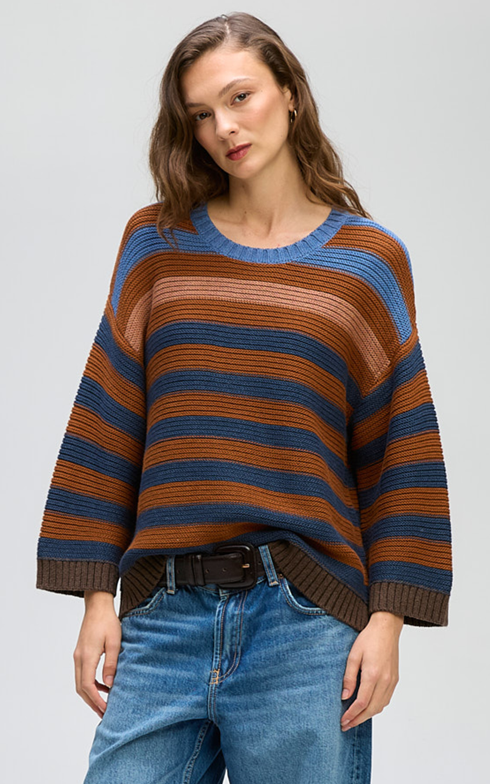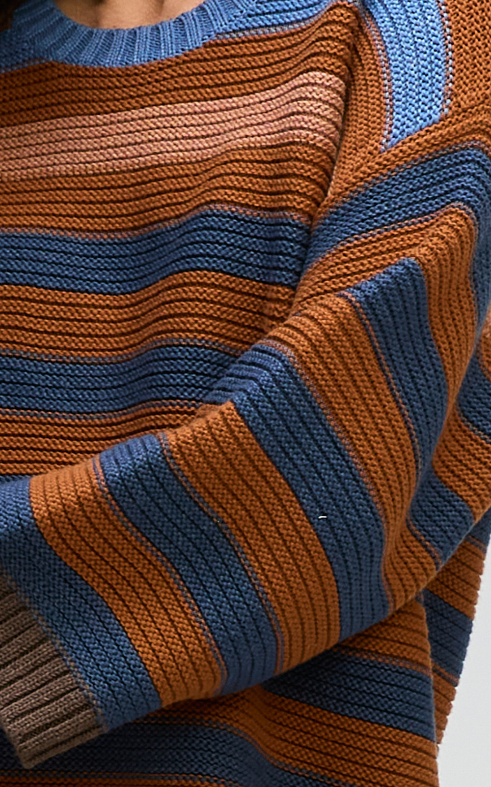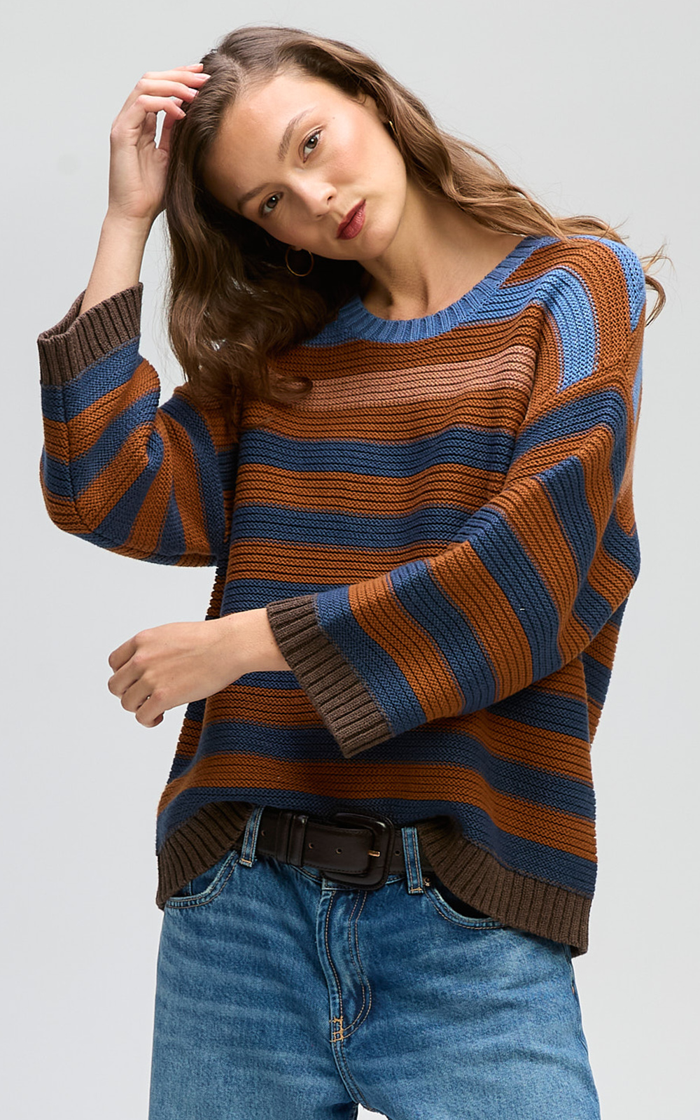 This textured knit features gorgeous tonal stripes in blues and chocolate hues. The Chunky Stripe Crew is designed with relaxed shoulders and finished with ribbed detailing on the hem, cuffs and crew neckline.