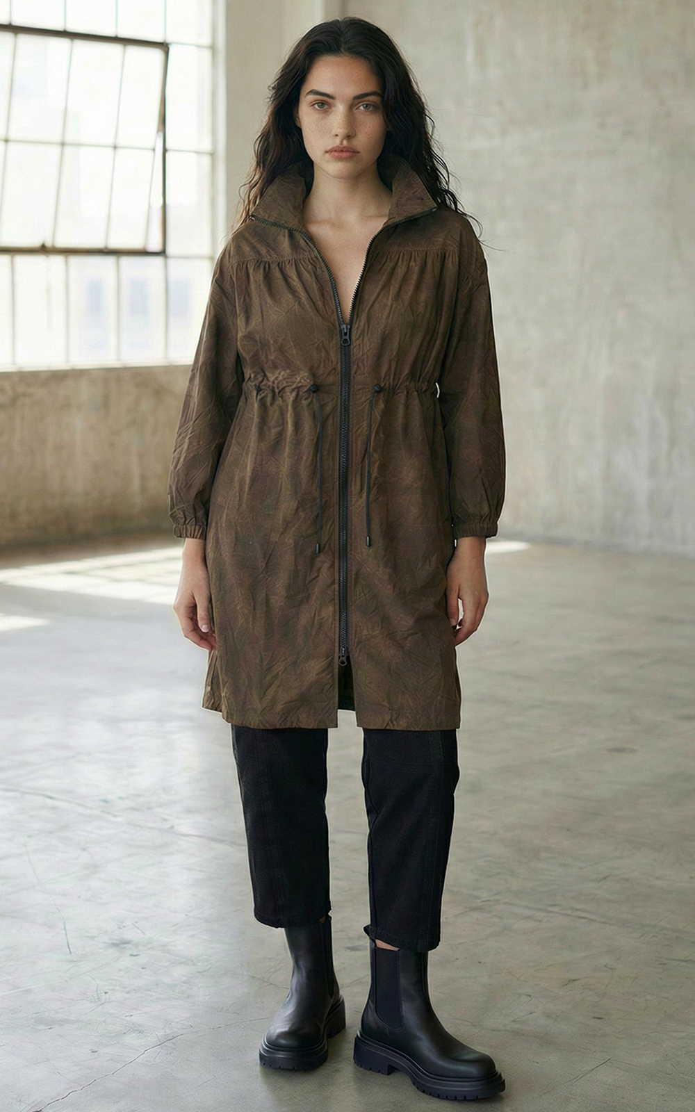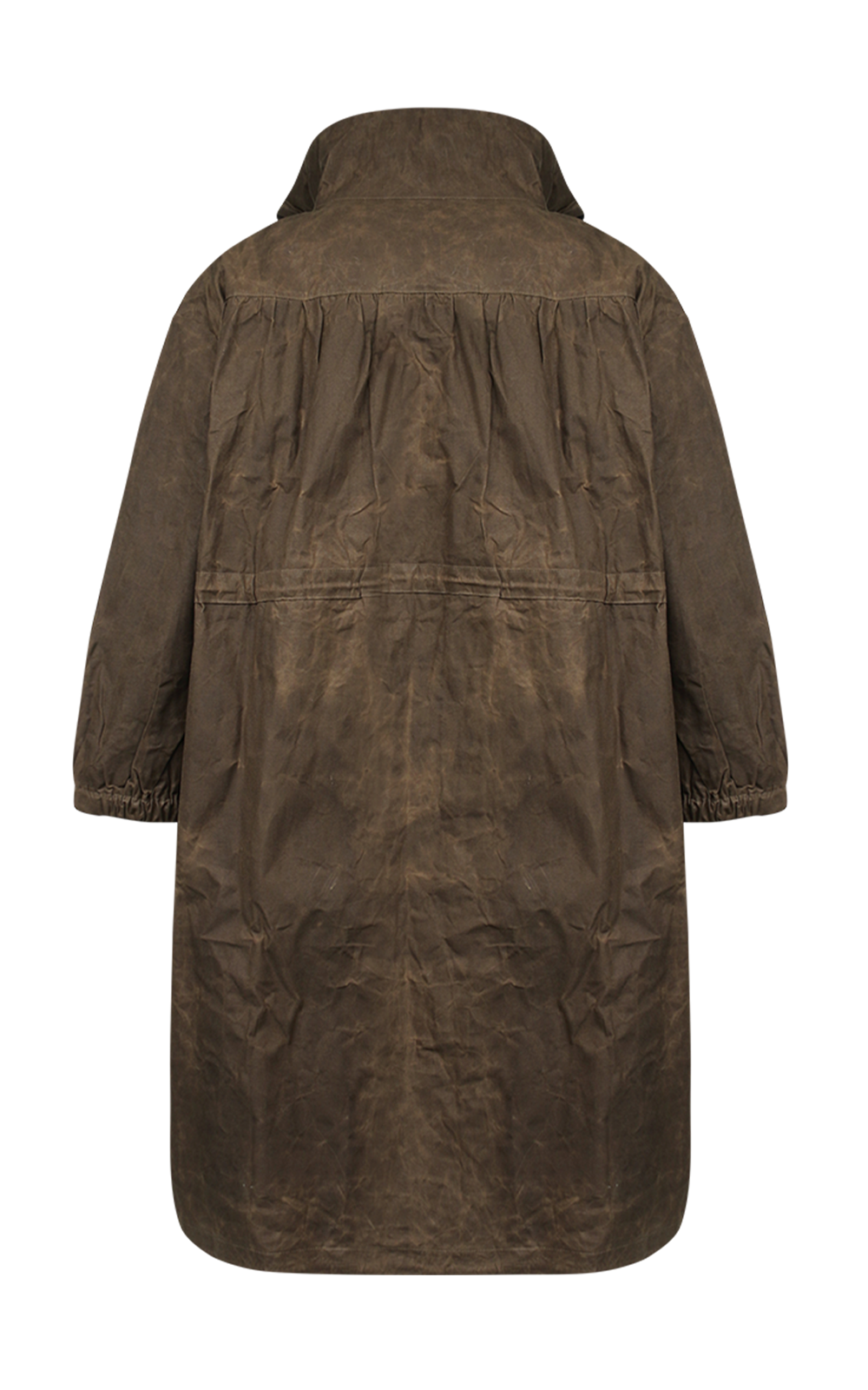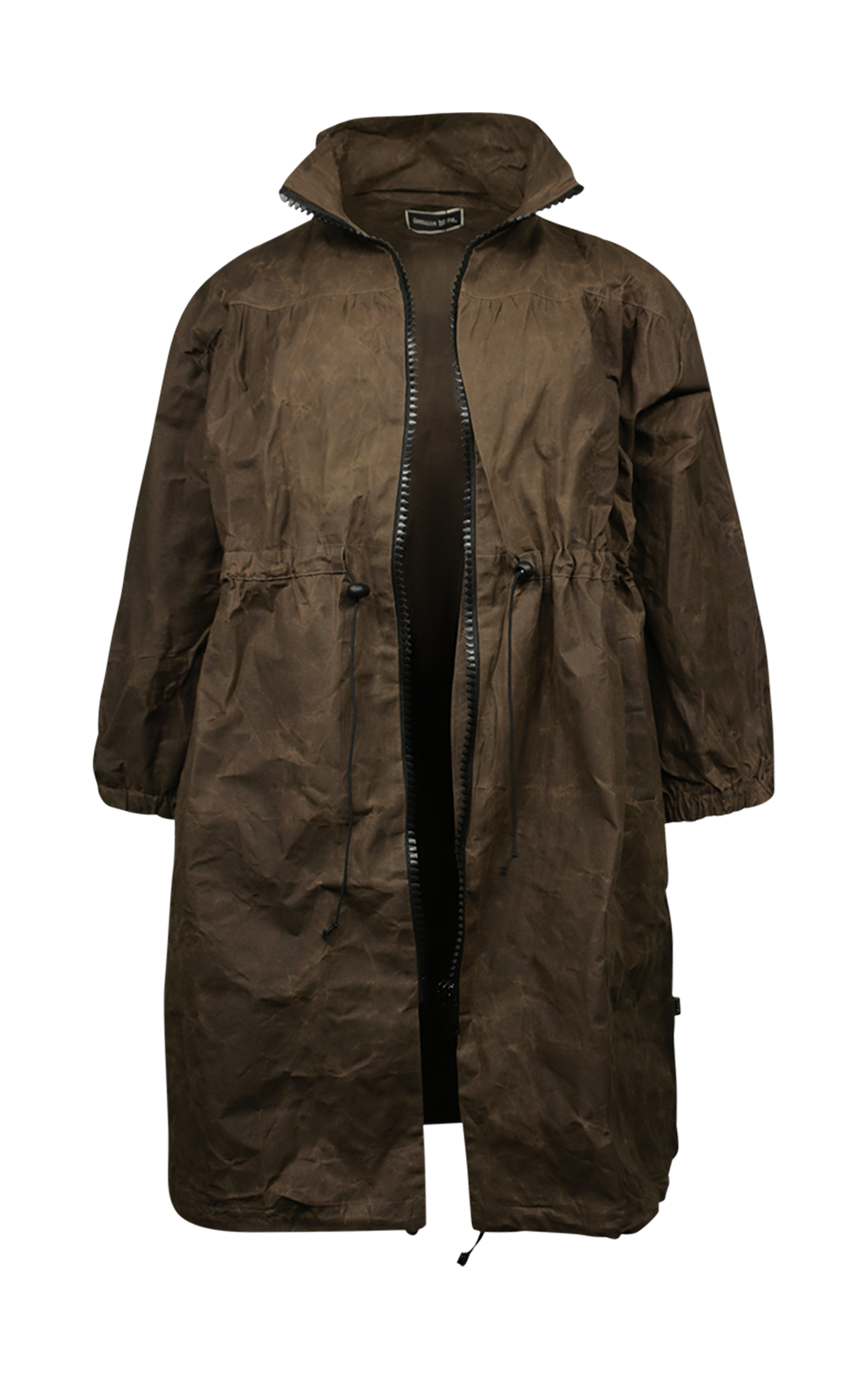 The East Parker is a statement anorak style designed with volume, and utilitarian edge. Crafted in a structured waxed cotton, this piece holds its shape and texture beautifully – scrunch it, layer it – the fabric keeps its character and depth. The waxed finish gives a subtle lived-in look while remaining durable and weather-conscious. Featuring a stand collar and double-ended front chunky zip, a gathered yoke detail adds softness through the upper body, while the adjustable bungee waist and hem allow you to shape the silhouette to suit your mood – relaxed or cinched. *Note This is a unique fabric, and each garment will have its own individual markings. Follow the care instructions on the label inside the garment. Please do not steam directly onto fabric outer, and only iron with a towel over the garment. To refresh the wax texture, gently heat the fabric with a hot hairdryer until softened (this will remove any spot marks), then scrunch to reshape and create your desired effect.
