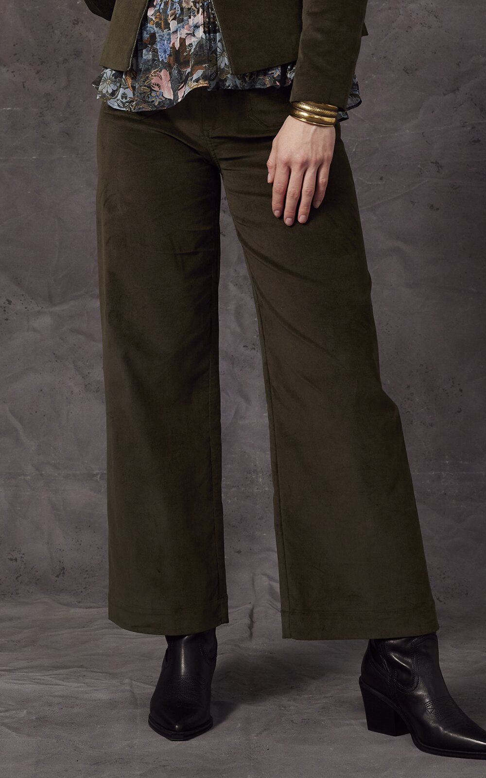 The Edith Pants by Loobies Story are perfect for autumn in a beautiful olive green. These wide-leg pants feature patch pockets at the front and back, a front fly opening, and belt loops.