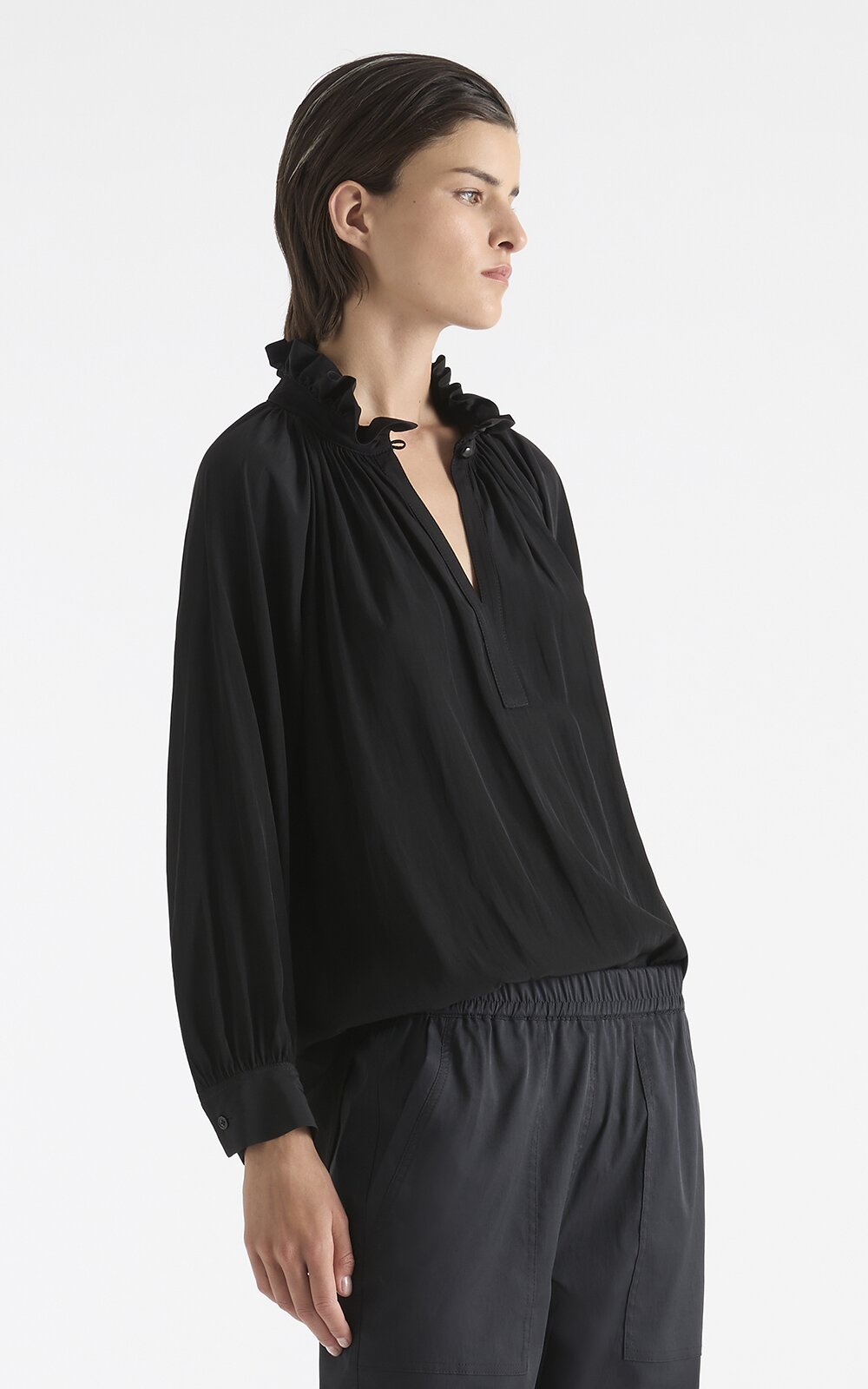 Cut from Mela Purdie’s fluid and luxurious Mache fabrication, the Fleur Blouse is your perfect wardrobe piece, with its flowy silhouette and billowy sleeves. The frill neckline splits into a V-neck that can be buttoned up with a shank button closure. Designed and Made in Australia.