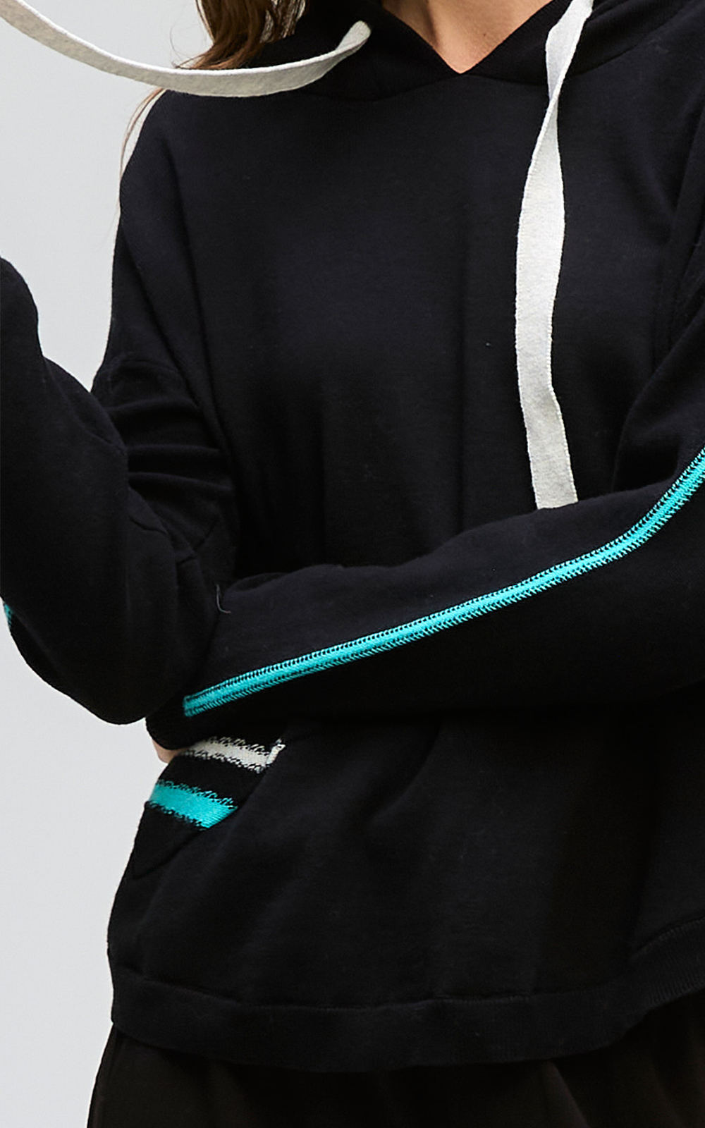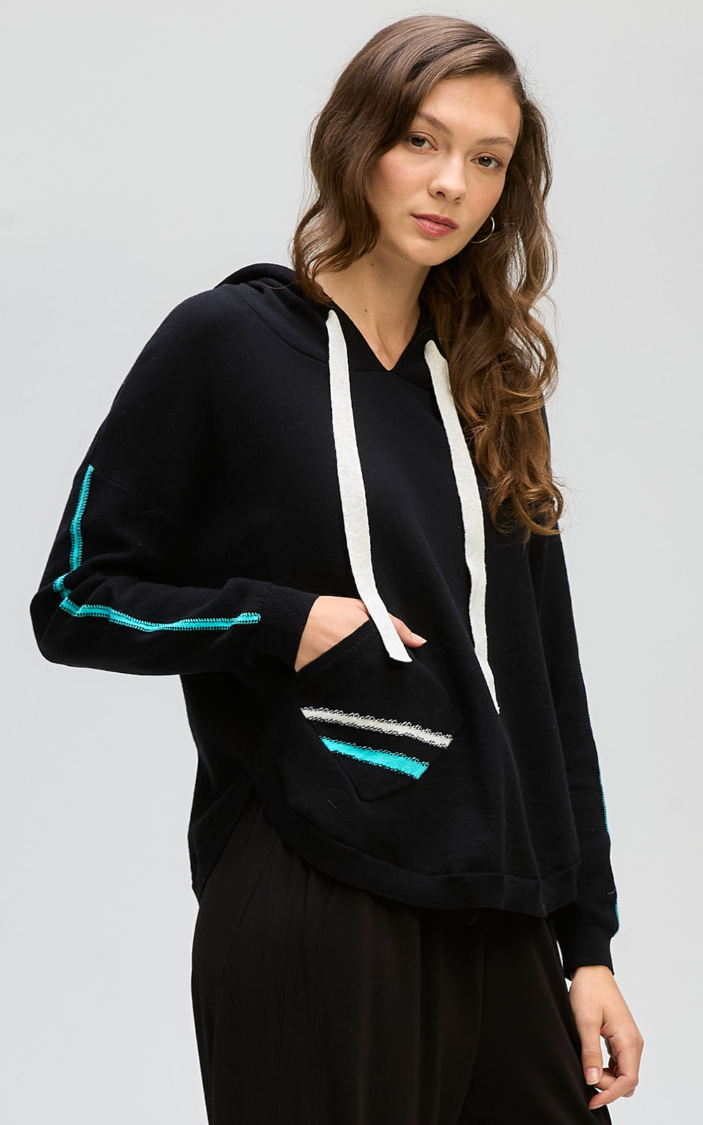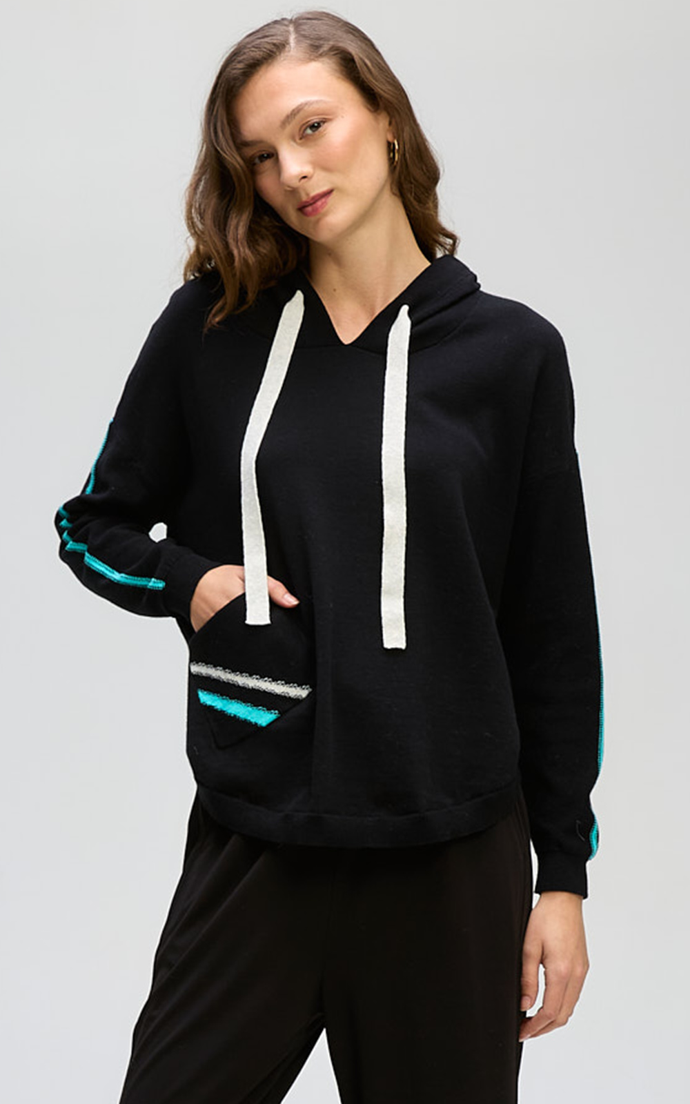 Gorgeous Hooded Jumper in soft midweight cotton knit, super cosy but not too hot. Featuring curved hems, front patch pockets, and a practical hood with chunky drawstring, finished with ribbed detailing and stripes down the sleeves and pocket. It’s relaxed, cosy, and an elevated jumper you’ll WANT to be seen in.