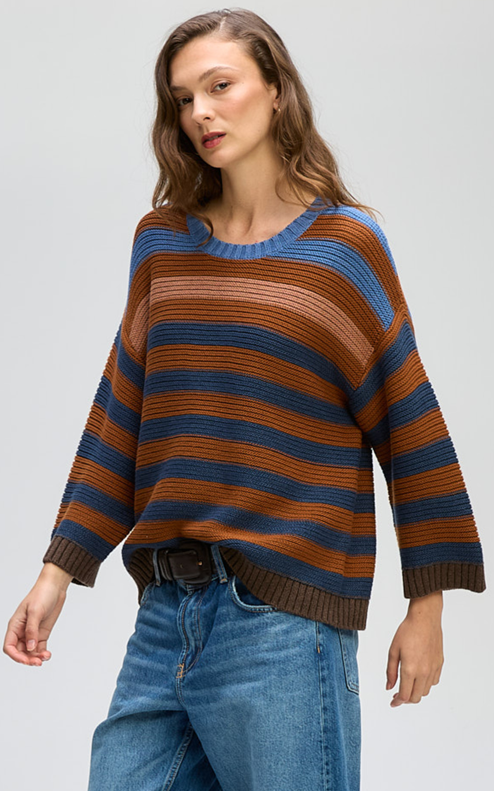 Gorgeous Hooded Jumper in soft midweight cotton knit, super cosy but not too hot. Featuring curved hems, front patch pockets, and a practical hood with chunky drawstring, finished with ribbed detailing and stripes down the sleeves and pocket. It’s relaxed, cosy, and an elevated jumper you’ll WANT to be seen in.