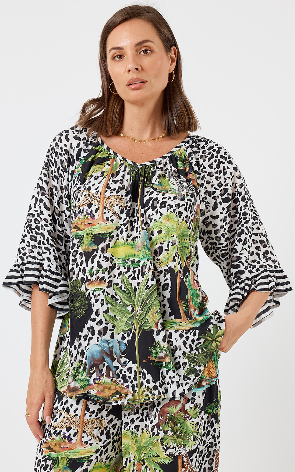 The Howdy Shirt in navy stripe is a soft cotton top with lively cowboy-inspired embroidery. Pink contrast stitching on the crew neck, button placket and gathered cuffs adds a cheerful pop, while the sleeve tab lets you roll it up for a relaxed half-sleeve style. Packed with personality, it’s a top that’s as fun to wear as it is versatile.