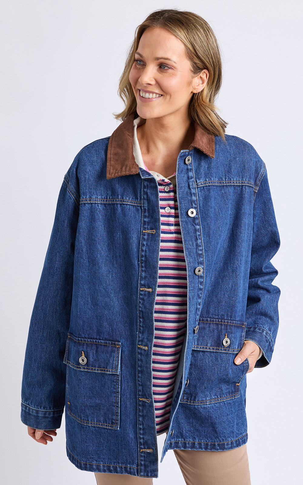 The In The Hood Jacket by Neris is a stylish cropped jacket with a hood and two front pockets with side access. It fastens with a front zip and snap buttons, while the hood features adjustable drawstrings with elegant bead detailing. The sleeves are finished with elasticated cuffs, combining practicality with contemporary style.