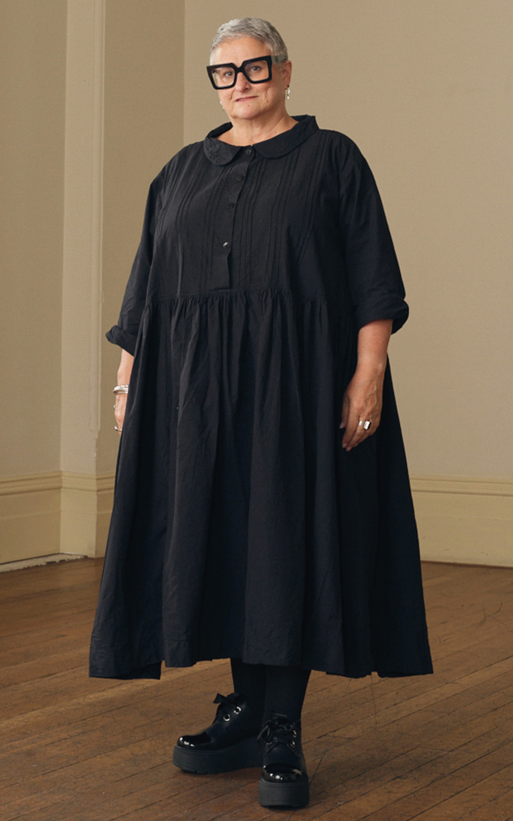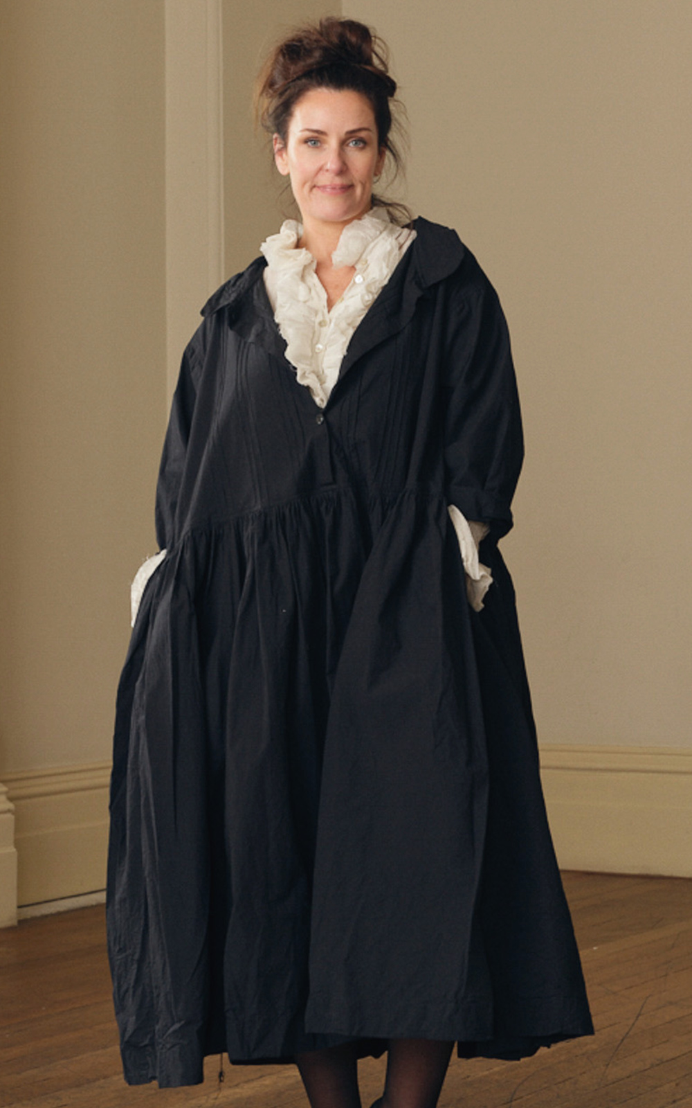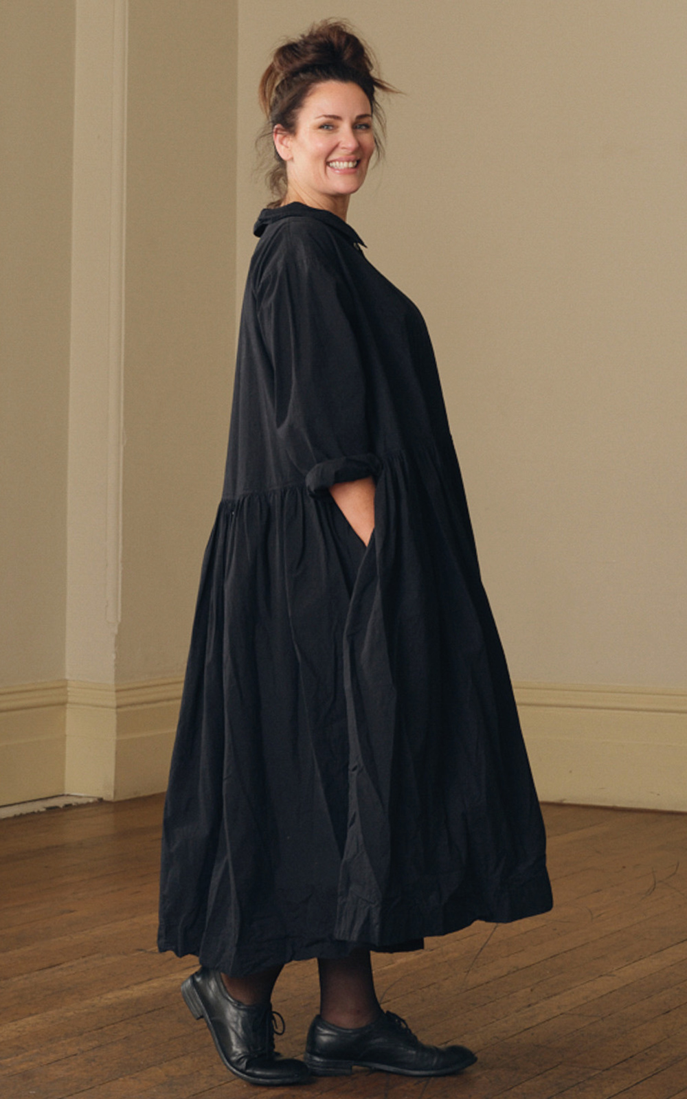 MBD’s Isaline Dress is made from cotton poplin with a natural structure and subtle texture. Designed with a rounded collar, subtle pleating through the bodice, and a soft button-down front that finishes at the slightly lowered waistline. Inseam pockets sit within the full gathered skirt, that moves beautifully with wearer. A whimsical but versatile piece that speaks for itself, but allows you to pair it beautifully, try it layered over with the Odile Tunic or style with cropped pants under. A romantic, timeless piece that brings ease, elegance and a little whimsy to everyday wear. General fit – S = 12-14, L = 1