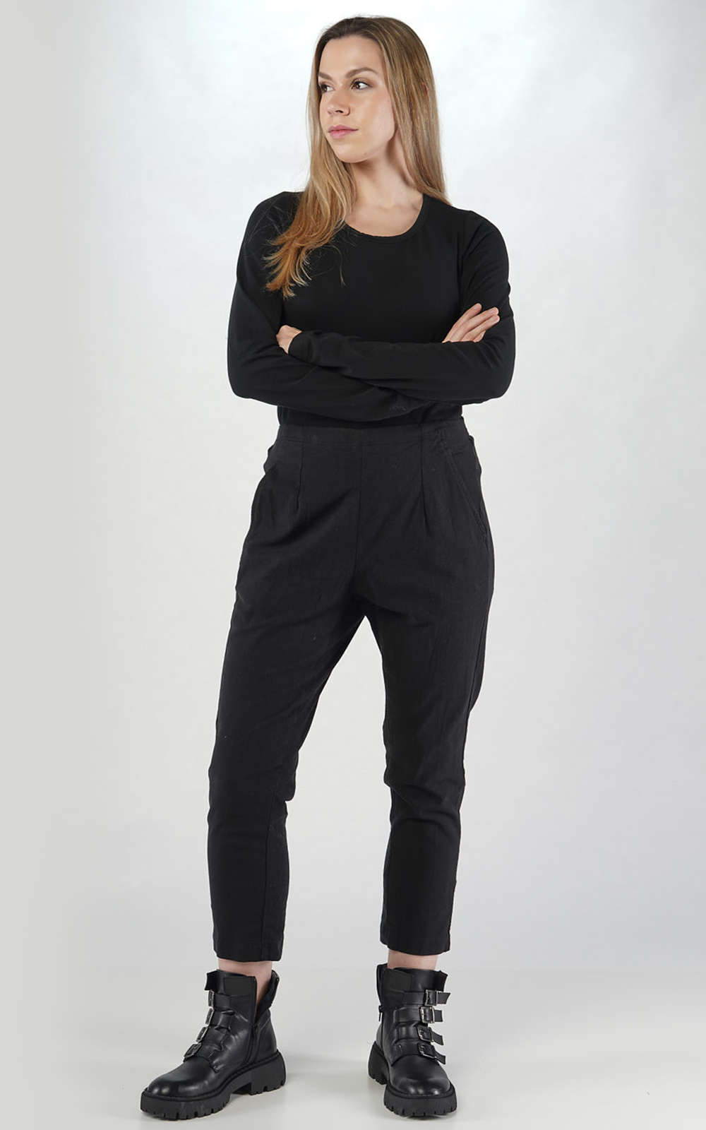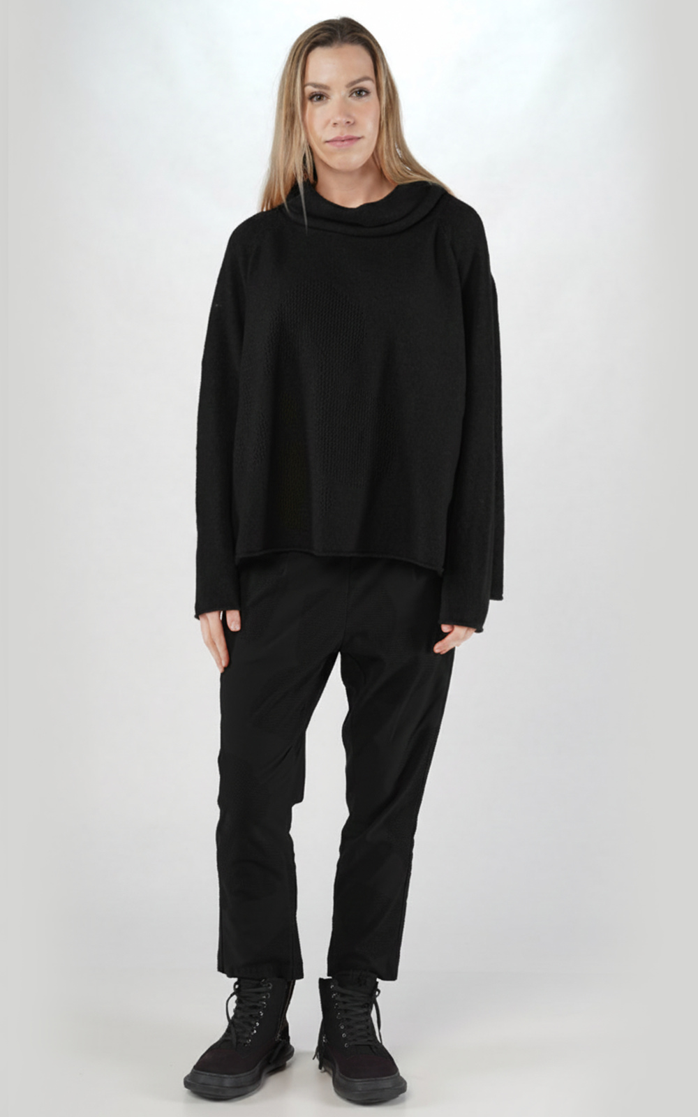 Rundholz Lily Relaxed Pullover is something special, a beautifully crafted wool blend jumper that you’ll be reaching for again and again through the season. This timeless style features a soft rolled neck, raglan sleeves and a relaxed silhouette. Rolled edges at the hem and sleeves finish this soft boucle knit jumper. The perfect layer to pop over tulip shaped dresses and skirts or pair with dropped crotch pants, finishing with bold accessories and chunky boots. Your next cool weather staple. *General fit –