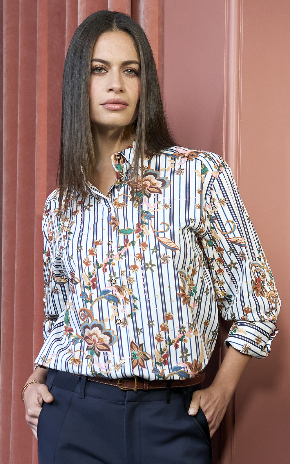 Man’s-style shirt in 100% cotton, with a classic collar and a buttoned placket, with shirt tails and side splits. Finished with adjustable double-buttoned cuffs for a tailored fit.