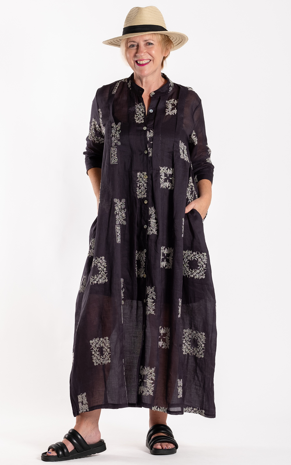 Simple at the front, standout at the back — the Menaka Dress blends everyday ease with a modern twist. Its relaxed A-line silhouette gently floats away from the body, featuring an inverted back pleat with a keyhole button detail for subtle charm and added movement. Finished with sleeves, a crew neck, side seam pockets, and a double-turn hem for a clean, polished look.