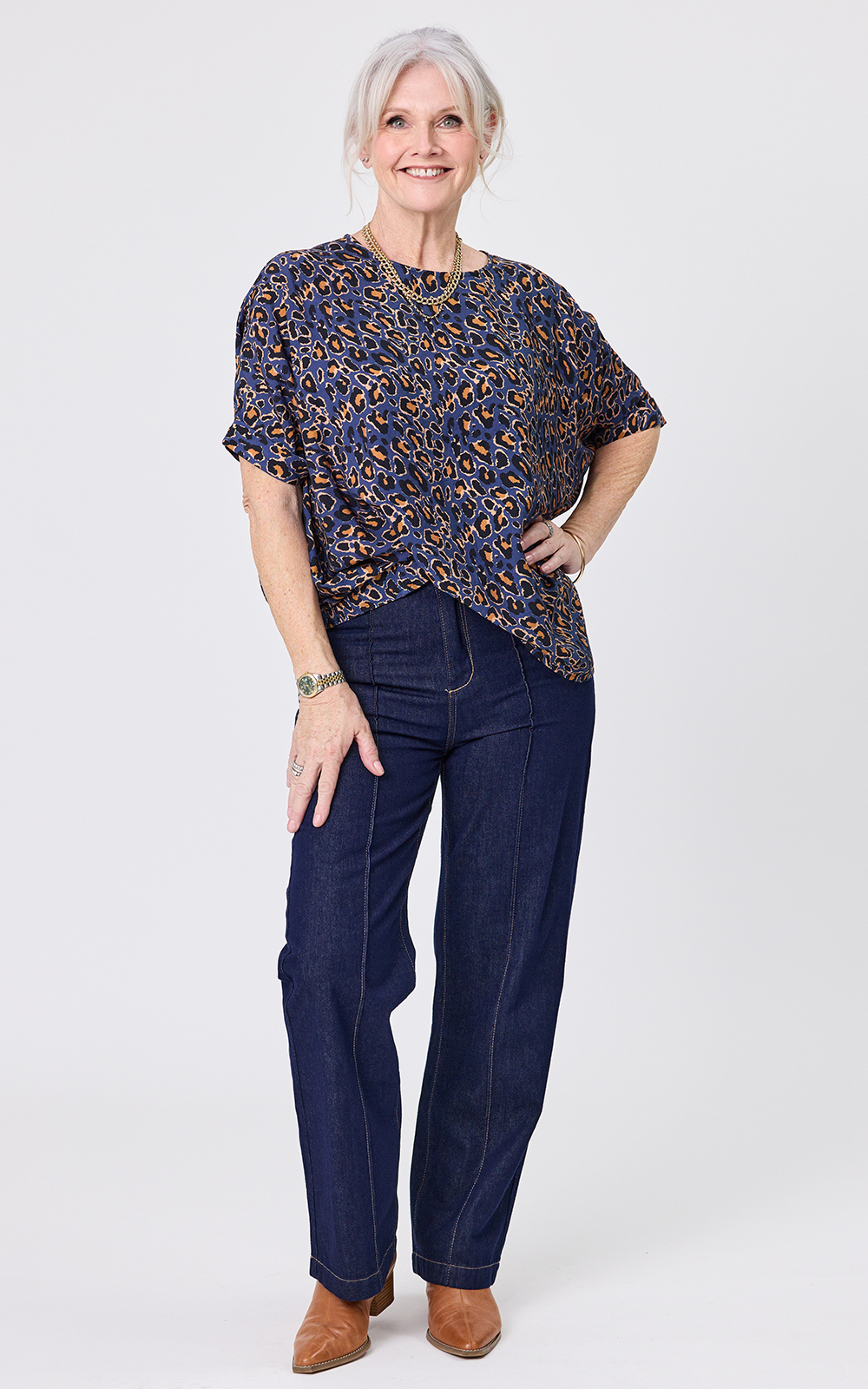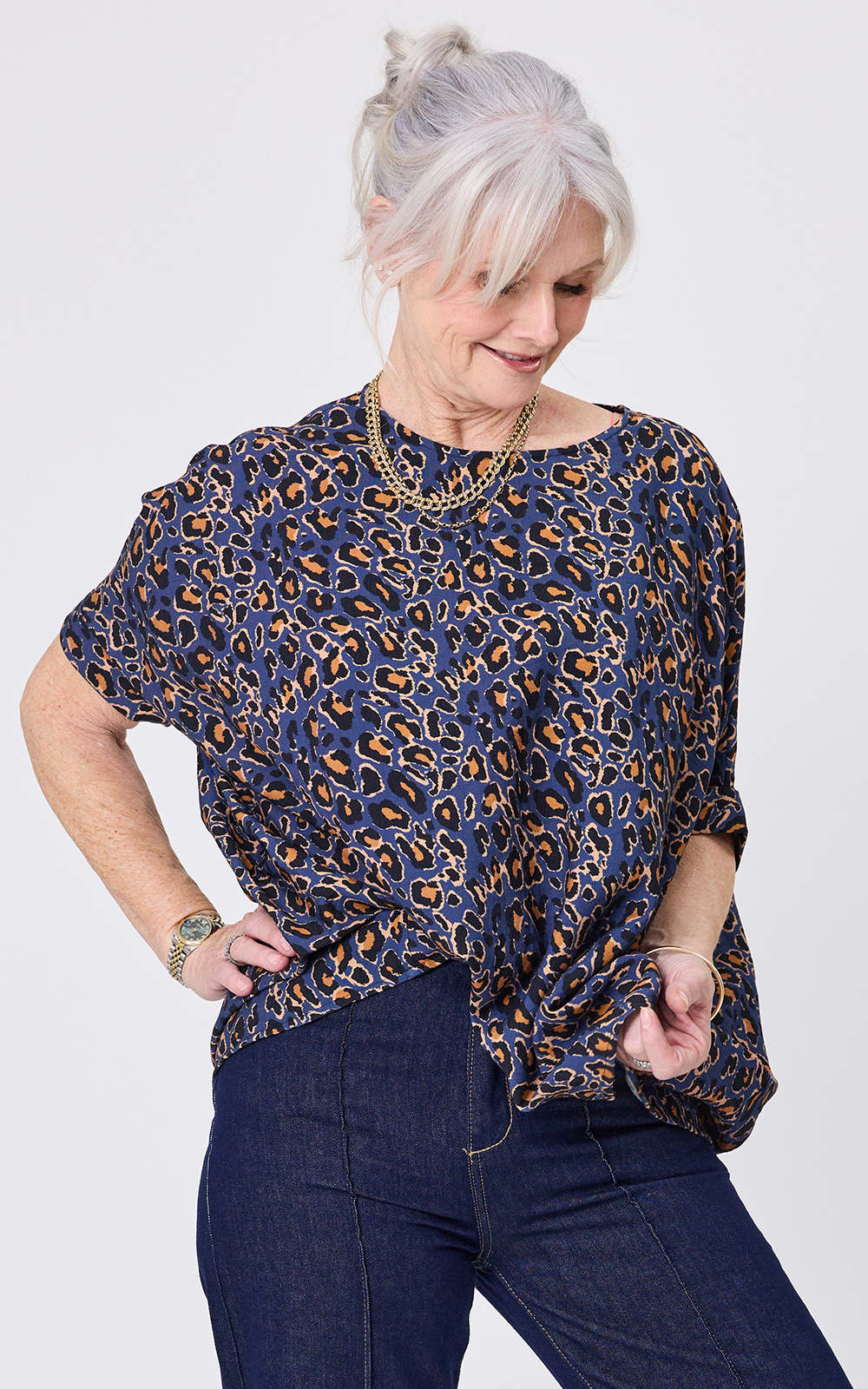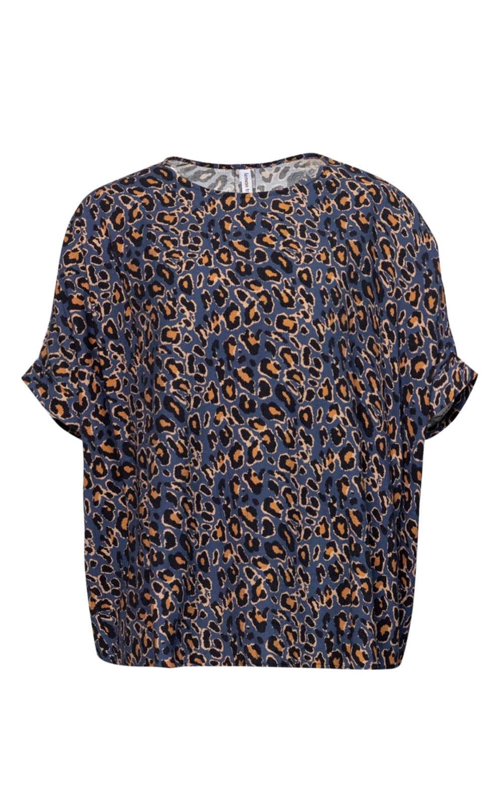 Kora Top is a short-sleeve top with an easy, relaxed fit, a crew neck, and slightly gathered sleeve caps. It features a bold all-over blue leopard print and is made from a rayon-rich stretch fabric.