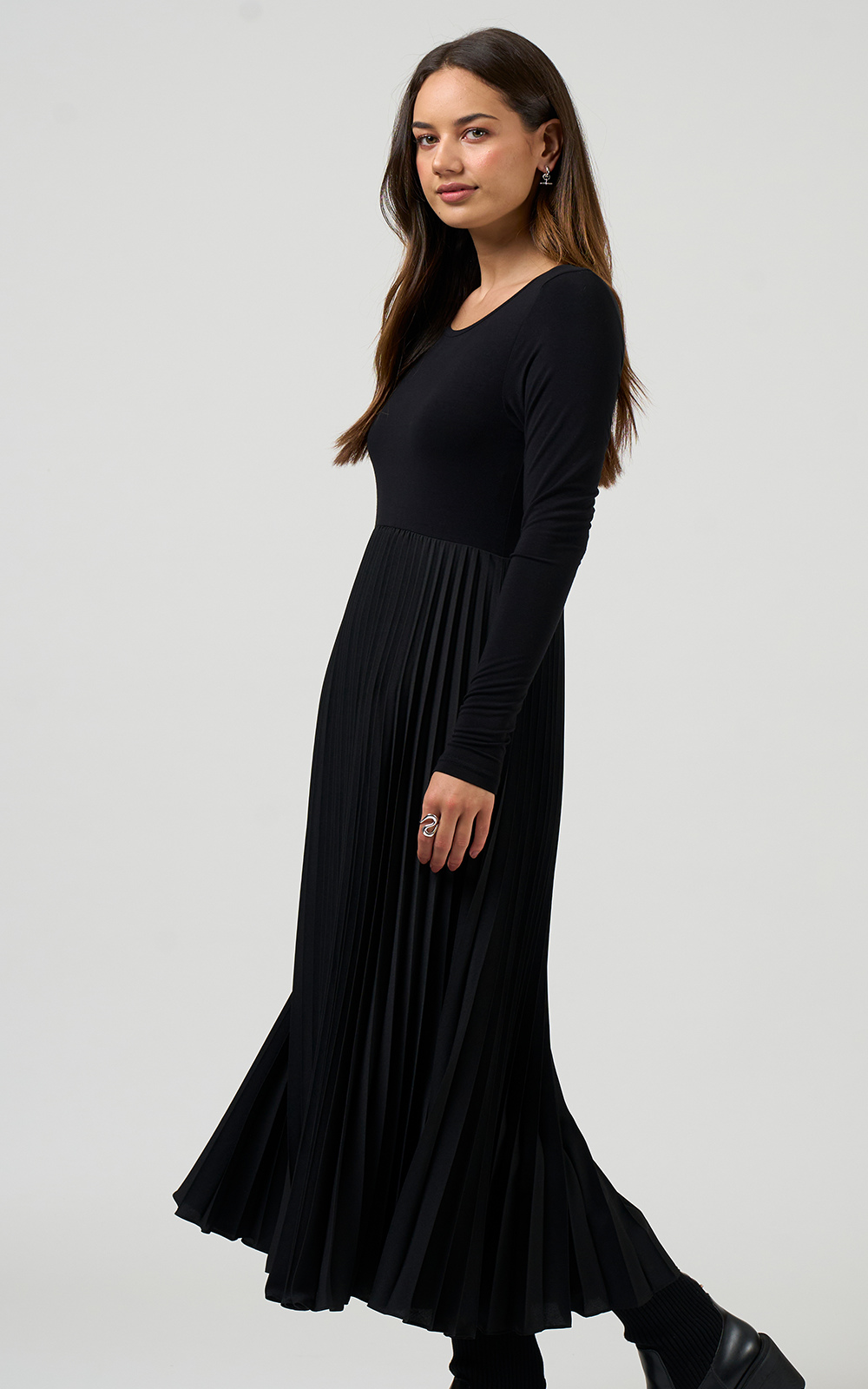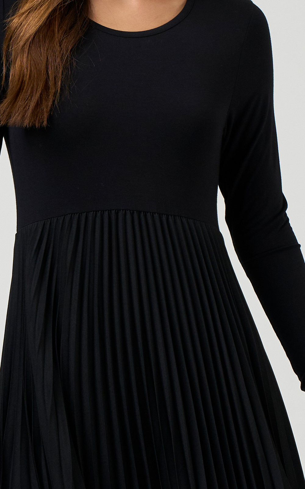 Midi length dress featuring a permanent pleated skirt and a soft fitted long sleeve crew neck bodice, perfect for layering.
