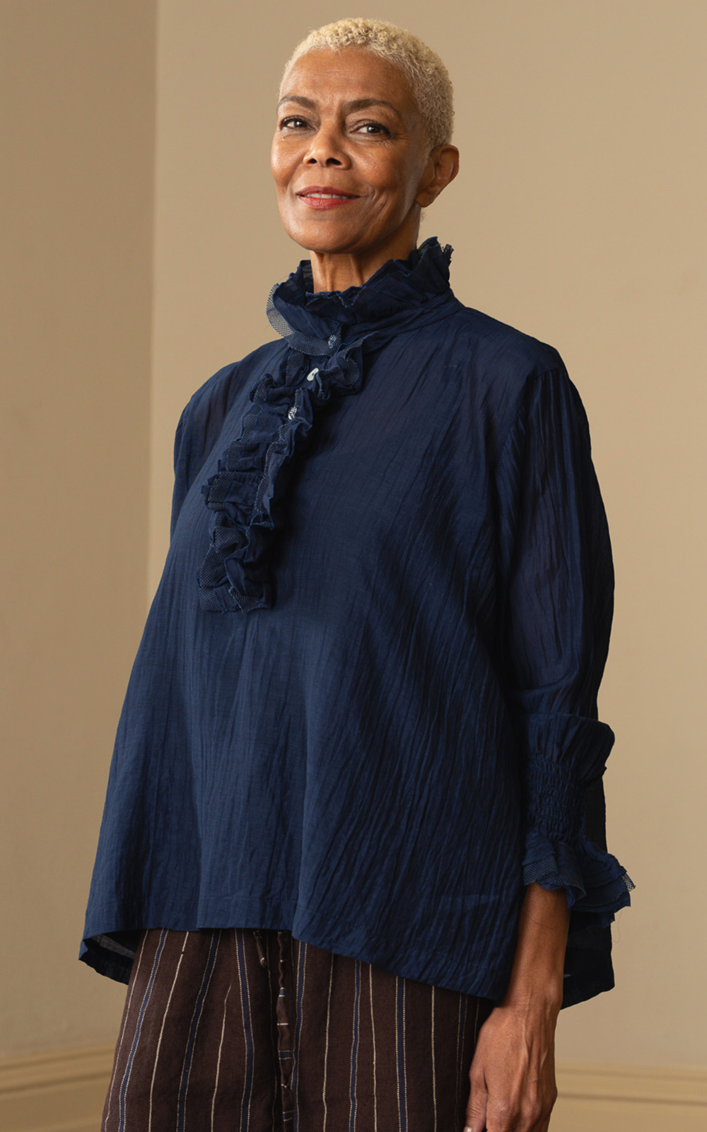 MBD’s Odile Blouse is crafted from a soft silk cotton blend that drapes effortlessly on the body. With luscious Victorian vibes, it features a ruffled collar, button front placket; each made from layers of silk cotton, cotton organdy, and cotton mesh. The back showcases vertical pleating, while the sleeves are softly ruched and ruffled to add texture and dimension. A romantic, timeless piece that brings ease, elegance and a little whimsy to everyday wear. Perfect under pinafore’s, knitwear and jackets. General fit – S = 12-14, L = 14-16, XL = 18-22.