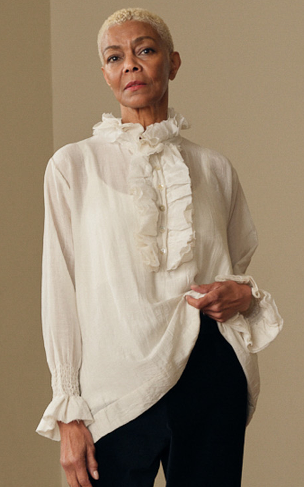 MBD’s Odile Blouse is crafted from a soft silk cotton blend that drapes effortlessly on the body. With luscious Victorian vibes, it features a ruffled collar, button front placket; each made from layers of silk cotton, cotton organdy, and cotton mesh. The back showcases vertical pleating, while the sleeves are softly ruched and ruffled to add texture and dimension. A romantic, timeless piece that brings ease, elegance and a little whimsy to everyday wear. Perfect under pinafore’s, knitwear and jackets. General fit – S = 12-14, L = 14-16, XL = 18-22.