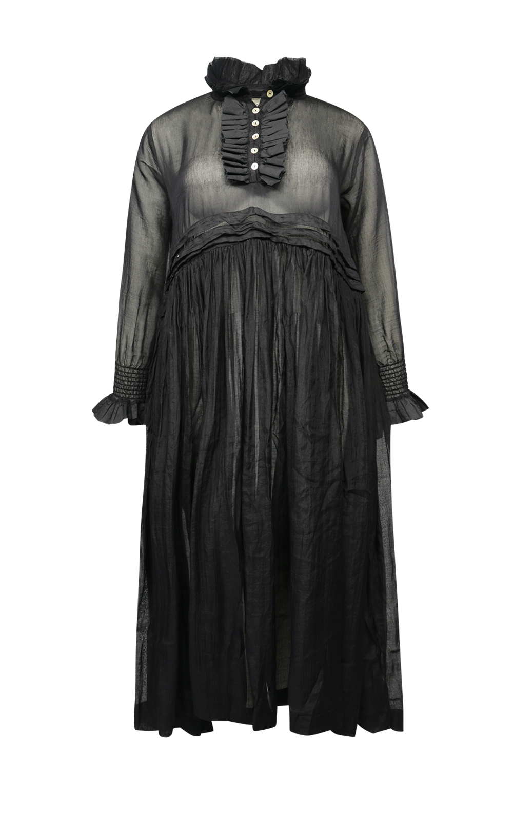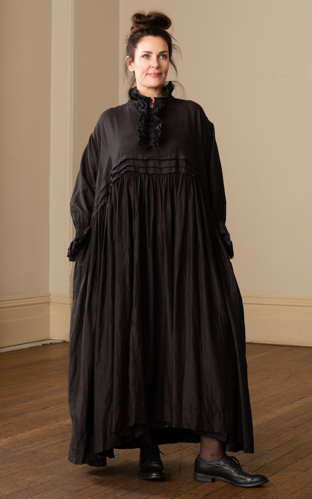 MBD’s Odile Dress is a stunning semi sheer dress crafted from a soft silk cotton blend that drapes effortlessly over the body. With luscious Victorian vibes, it features a ruffled collar, a button front placket, while the set-in sleeves are softly ruched and ruffled to add texture and dimension. Made from layers of silk cotton, cotton organdy, and cotton mesh; stunning pleating highlights the waistline, raised in the front and dropping in the back, which showcases additional vertical pleating. A romantic, timeless piece that brings easy elegance and a little whimsy to your wardrobe. General fit – S = 12-14, L = 14-16, XL = 18-22.