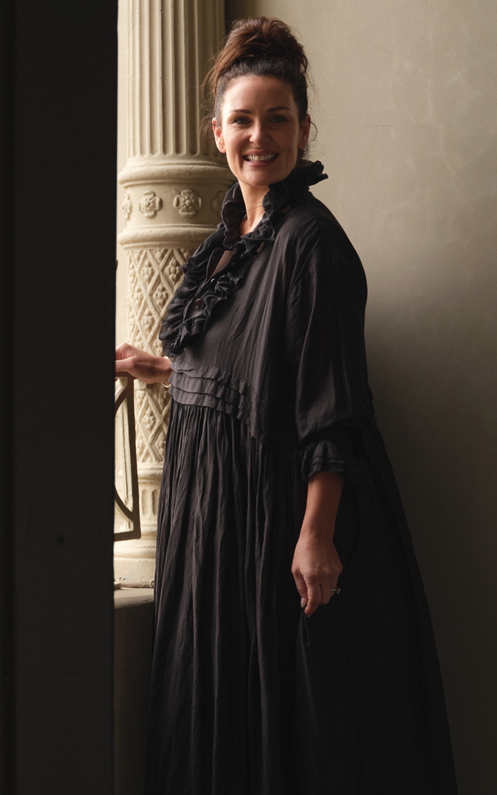 MBD’s Odile Dress is crafted from a soft silk cotton blend that drapes effortlessly on the body. With luscious Victorian vibes, it features a ruffled collar, a button front placket, while the sleeves are softly ruched and ruffled to add texture and dimension. Made from layers of silk cotton, cotton organdy, and cotton mesh; stunning pleating highlights the waistline, raised in the front and dropping in the back, which showcases additional vertical pleating. A romantic, timeless piece that brings ease, elegance and even a little whimsy to everyday wear. General fit – S = 12-14, L = 14-16, XL = 18-22.