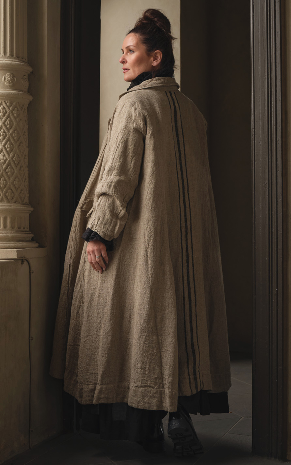 It features a subtle curved hem, a classic collar with natural shell buttons, and front flap pockets that add a little something to the overall design. Down the back runs a natural black stripe, reminiscent of a traditional grain sack — a detail that grounds the piece in tradition.
