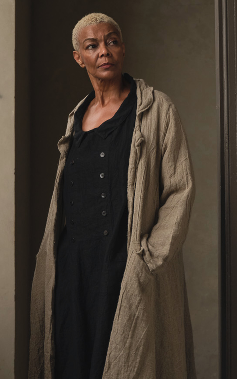 Made from a beautiful heavyweight raw linen, the purest and most natural form of flax; and lined with soft 100% cotton in a cream ticking stripe. The silhouette falls with ease, oversized and feminine, designed to move with the body rather than restrict it.