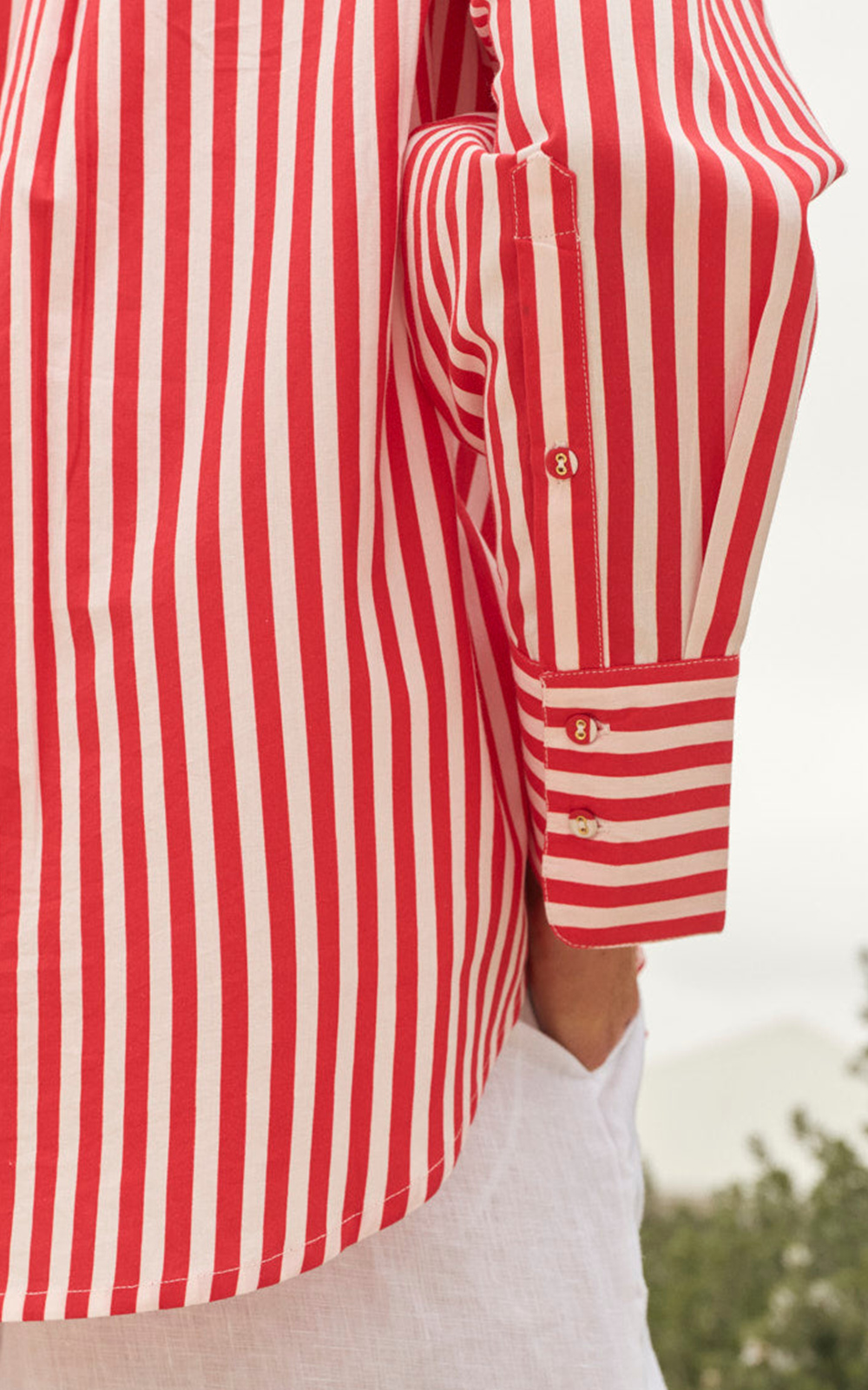 Effortless, timeless, and made for everyday ease, the Oversized Boyfriend Shirt is crafted from crisp 100% cotton for a relaxed yet tailored finish. Featuring a classic button-down front, and collar, long sleeves with buttoned cuffs, and a curved high-low hemline, it’s perfect for layering under knits and blazers or wearing on its own. The navy and white stripe print adds a fresh, classic touch, making this shirt a versatile wardrobe staple you’ll reach for again and again.