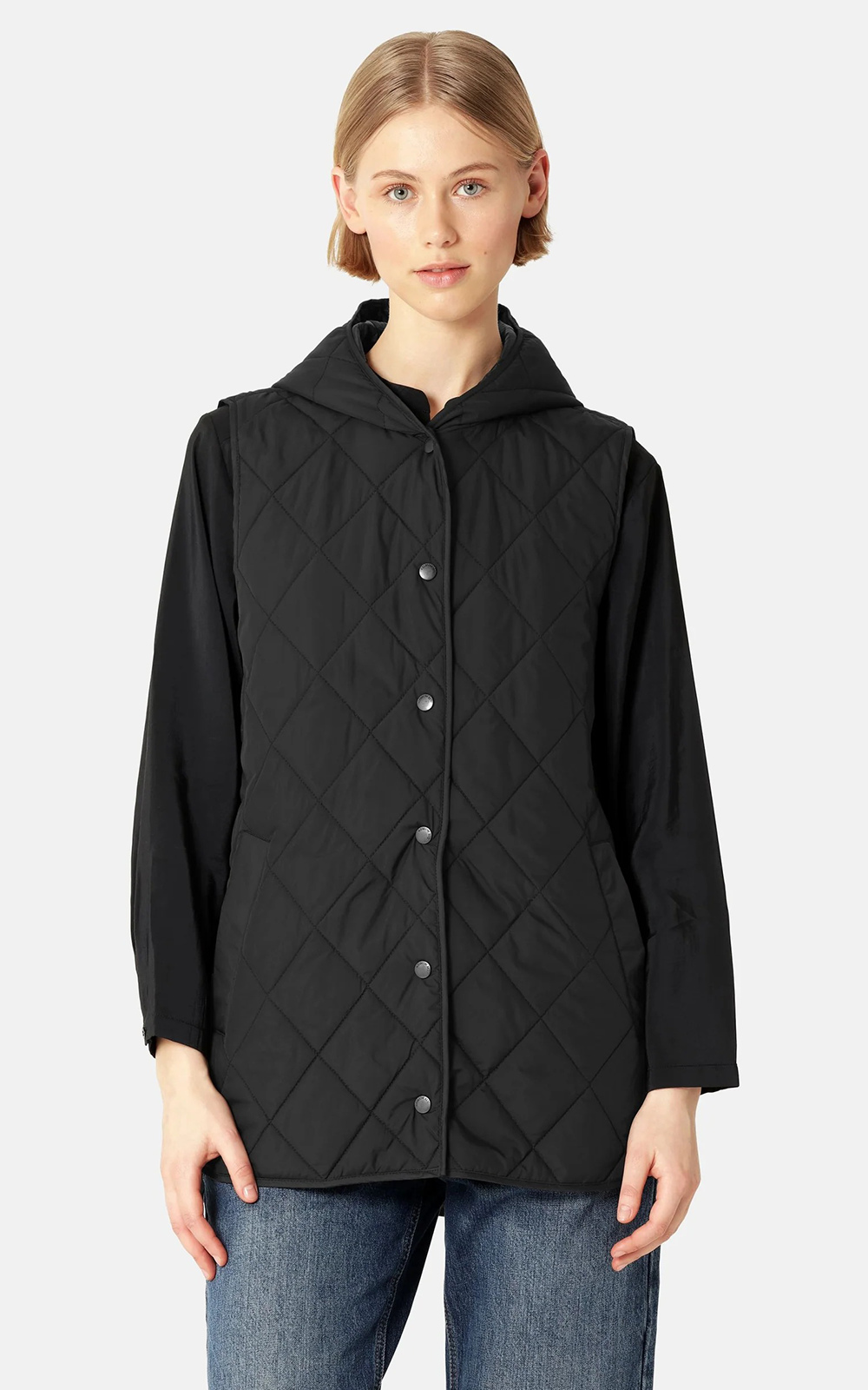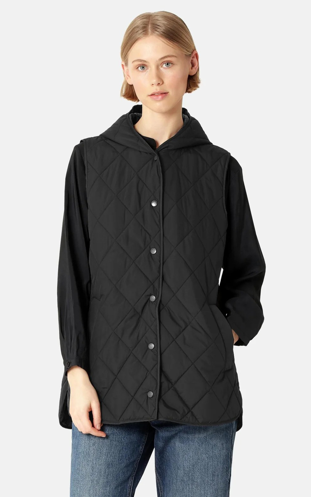 A long, slightly A-line padded vest featuring a diagonal quilted pattern and a hood for added warmth. Slanted jetted pockets provide both style and comfort, while logo buttons at the front add a branded detail. A curved hemline with side slits enhances ease of movement.