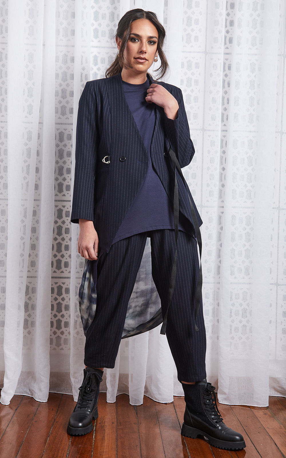 Experience the perfect combination of style and comfort with the Pinstripe Devon Pant, crafted from luxurious hand-feel twill fabric. Designed for a flattering, relaxed fit, these pull-on pants feature a sleek, flat front and a concealed elasticised back for ultimate comfort. The clever ankle dart design allows the pant to come in gently at the hem, creating a flattering silhouette that enhances movement and flow. Pair them with the coordinating Pinstripe Blazer for a sophisticated ensemble that combines elegance with ease.