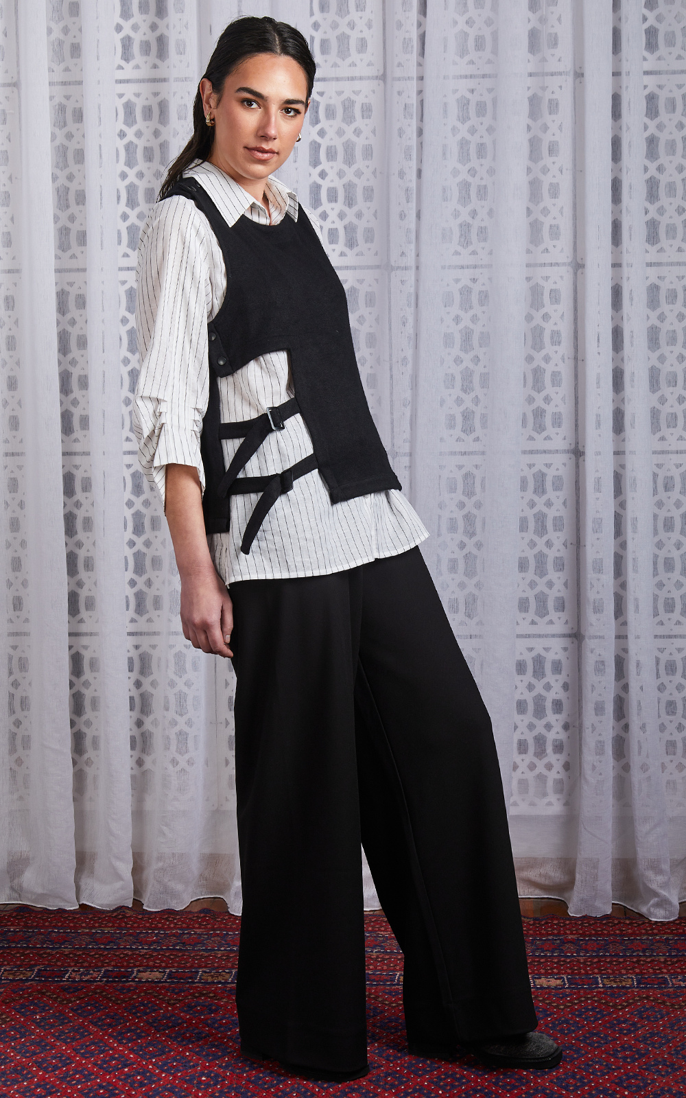 An exploration of contrast and form, the Plush Layer Top reimagines the idea of structure in comfort. Designed as an architectural statement piece, transforming everything layered beneath it. Cut from soft luxurious plush jersey, giving it an effortless a sculptural silhouette. A clean, rounded neckline and precise panel lines create a modern shape, offset by the tactile warmth of the jersey. Functional detailing defines the design side openings fastened with adjustable buckle straps and subtle snap closures introduce both utility and movement. Effortless yet commanding, an essential for those who dress with intention, but without fuss, bringing dimension to everyday dressing, elevating foundational layers into something sculptural. The Plush Jersey Vest is edgy, fashion-forward, and infinitely wearable, a piece that blurs the line between utility and art, comfort and statement.