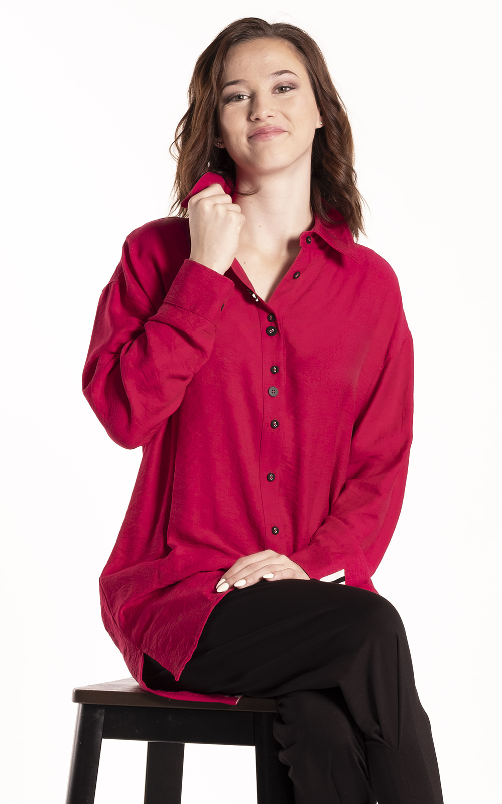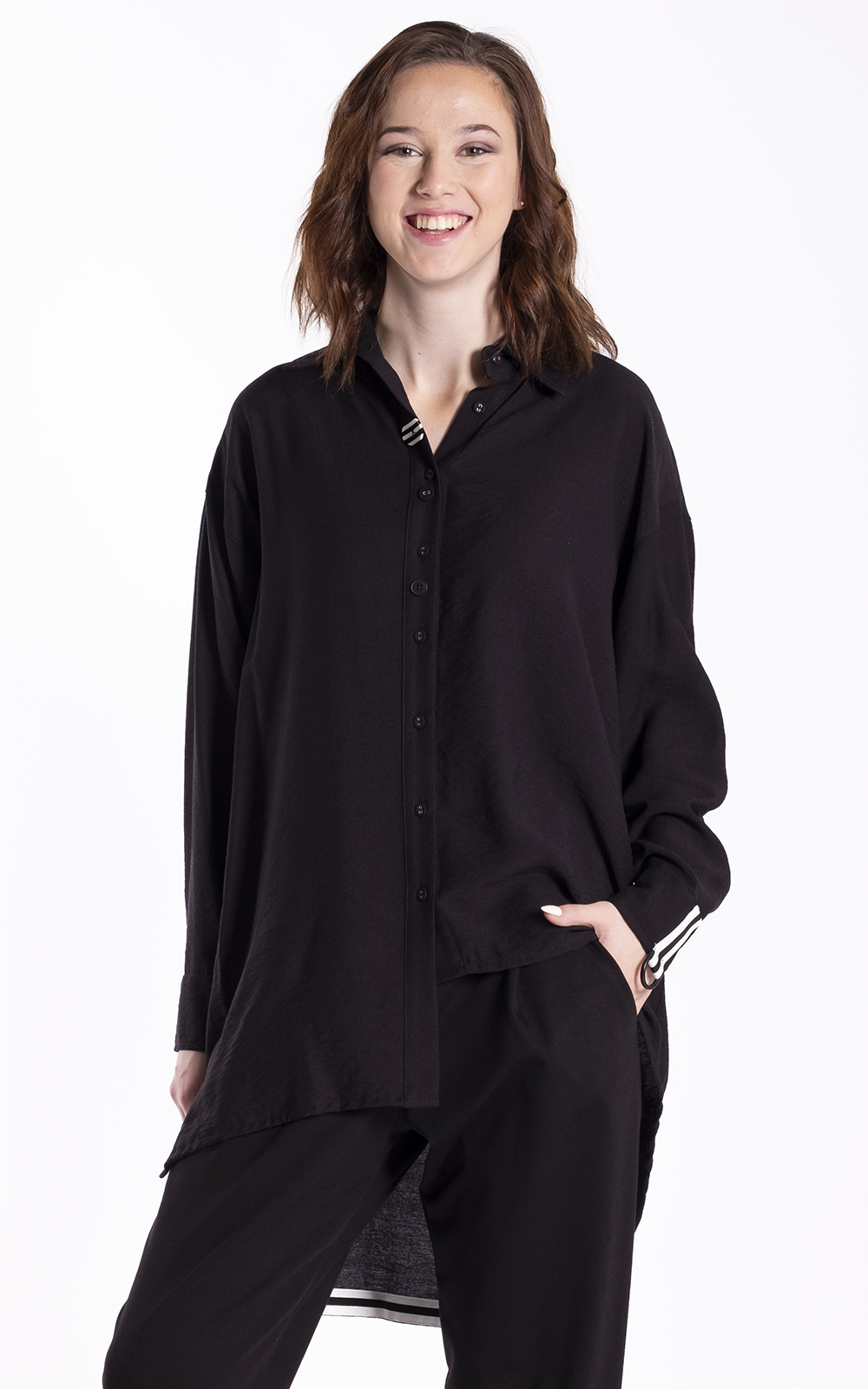 The Professor Shirt is a softly structured women’s style designed with a relaxed, wearable silhouette and thoughtful tailoring details. Featuring a classic shirt collar, button-through front, and long sleeves with cuff finish, it offers ease through the body while maintaining a refined shape. Extra button detailing adds subtle interest without disrupting the clean, versatile look, and a curved hemline completes the structured design. The Professor Shirt is an effortless piece that works perfectly styled casually or layered for a more polished outfit.