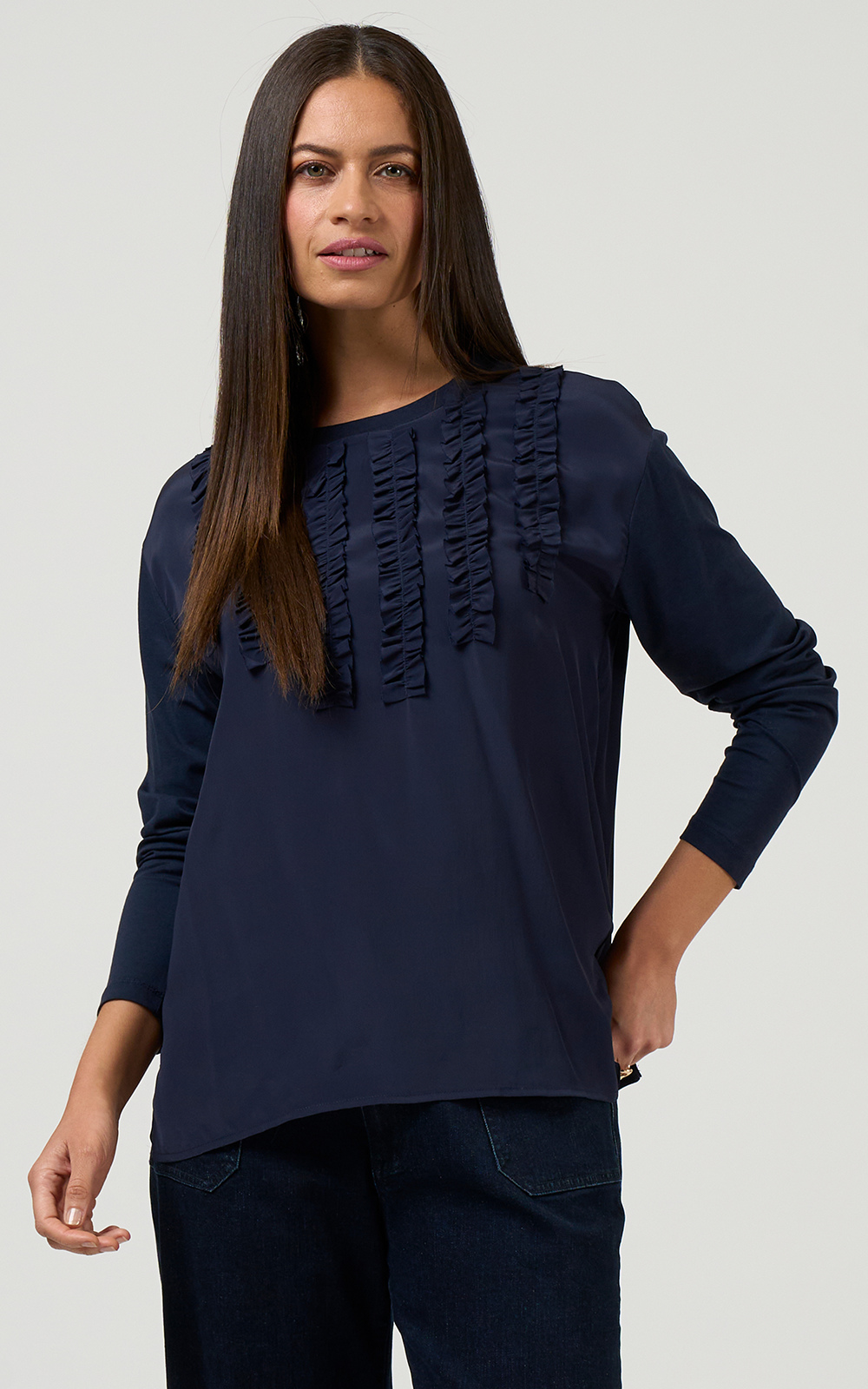 Relaxed long sleeve tee with a crew neck, featuring tuxedo-inspired front ruffle detail, with a back neck split secured by button and loop. Finished with stretch jersey sleeves for comfort and ease of movement.