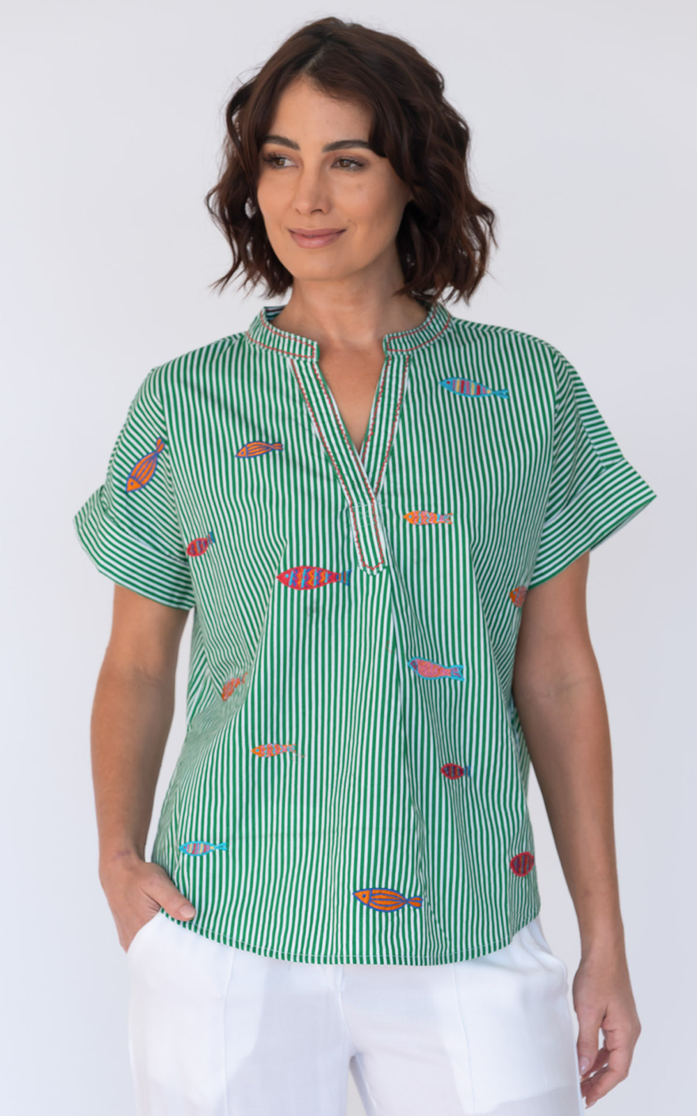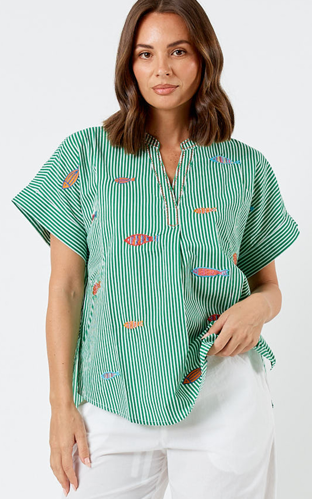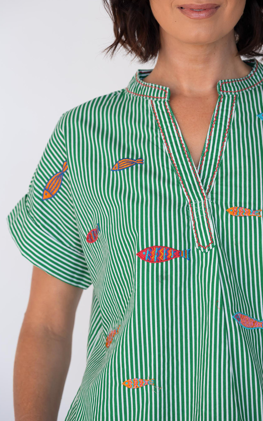 The Sardine Top is made in Cotton with a split V-neckline, embroidered sardine motifs, and a high-low hem with side splits. Pair with crisp white linen or your favourite denim – a whimsical take on the coastal aesthetic.