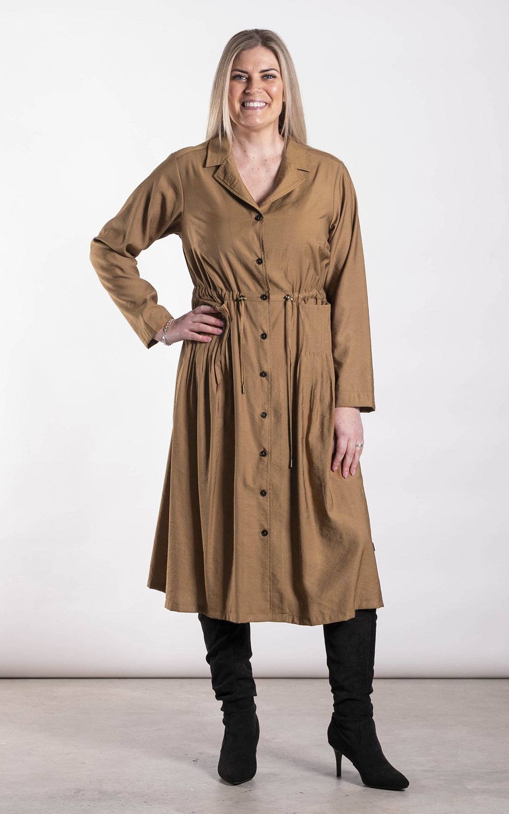 The Shadowlines Pleat Jacket by Deeanne Hobbs is a versatile cotton-blend piece designed to work your way. Wear it as a longline jacket or button it up and style it as a dress-two looks in one. Thoughtful pintuck detailing elevates the front pockets, while the adjustable drawstring waist lets you customise the shape. Finished with a button-up front, long sleeves, bust darts and a classic notched collar, it’s complete with bronze hardware for a subtle edge. A seasonless must-have and an easy layering piece you’ll reach for again and again.