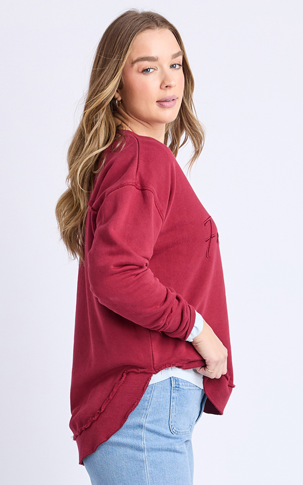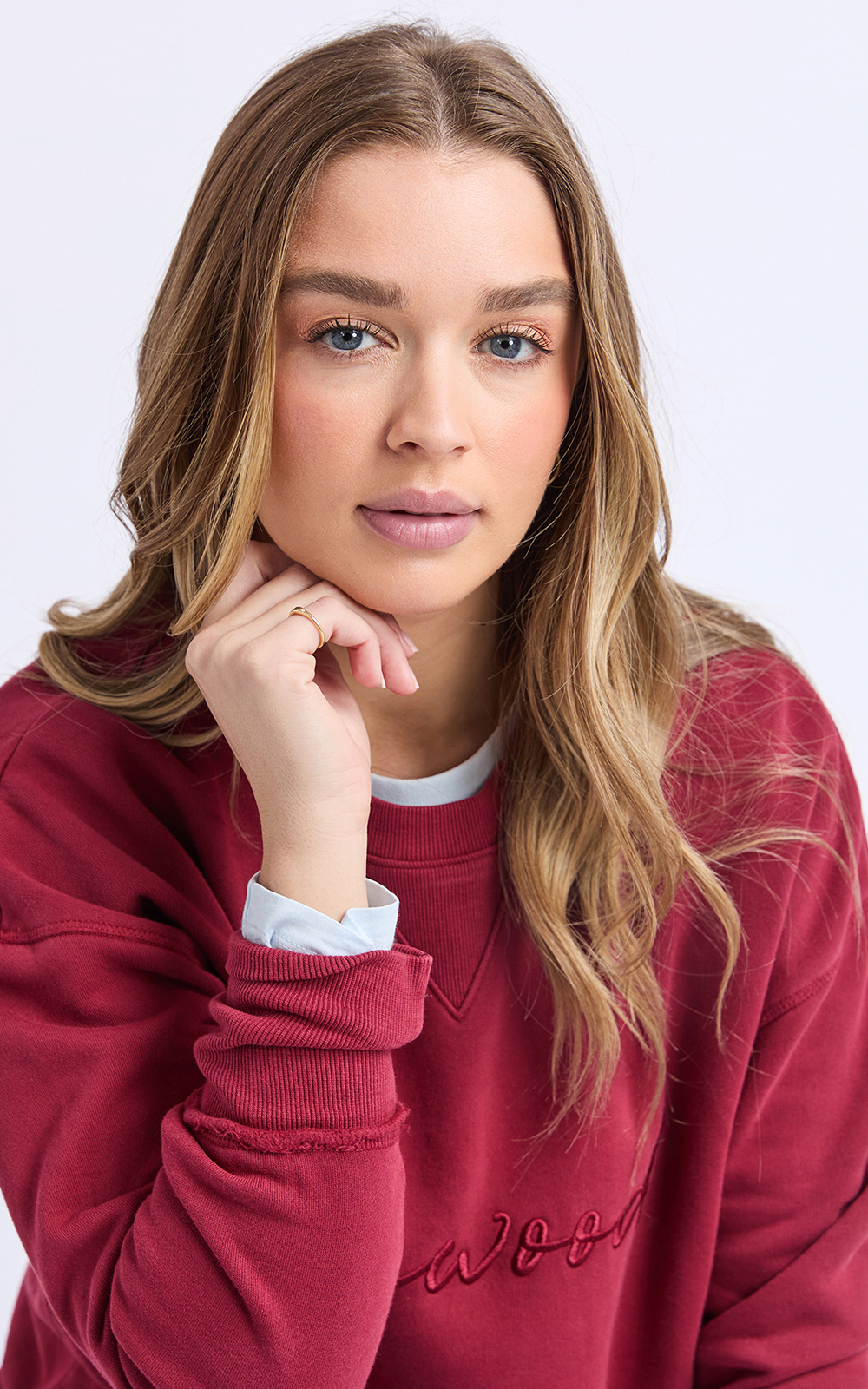 The Simplified Crew in Rhubarb Red is an easy, everyday layer with a clean, minimal feel. It features the Foxwood logo in subtle tonal embroidery across the front, with a classic crew neckline and long sleeves. Designed with a drop shoulder, it has a relaxed, boxy fit and a mid-length hi-lo scooped hem for effortless styling. Made from unbrushed cotton fleece for a soft feel.