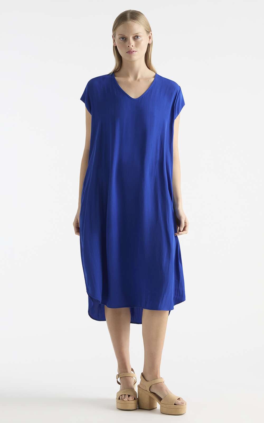 Crafted from Mela Purdie’s Mache, featuring a relaxed fluidity and smooth lustre surface. The Slide Dress features a soft v-neckline, an a-line silhouette for a light airy feel; it’s completed with curved hemline, cap sleeves and inseam pockets. A travel friendly piece that’ll take you from day into evening with ease.
