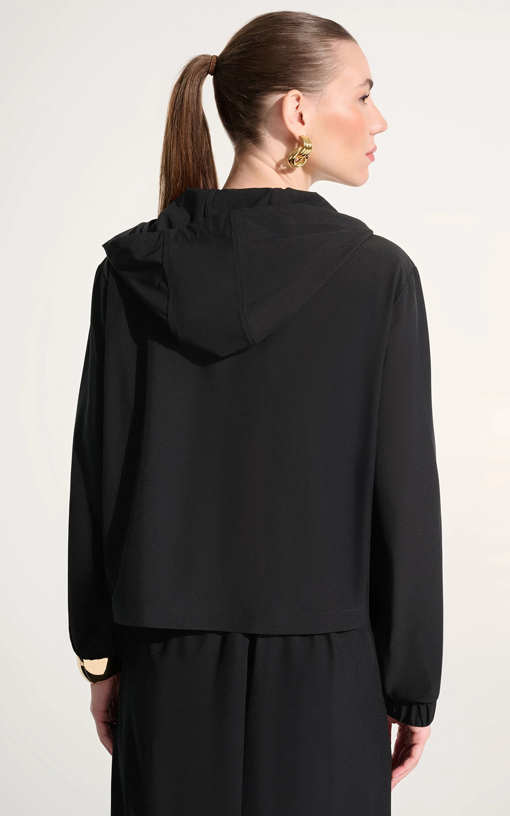 Crafted from lightweight stretch woven fabric, this boxy hooded jacket combines effortless style with practical versatility. The crew neckline and cuffed long sleeves create a polished silhouette, while the unlined construction ensures breathable comfort for layering. Its relaxed utility aesthetic makes it an essential piece for contemporary casual wardrobes.