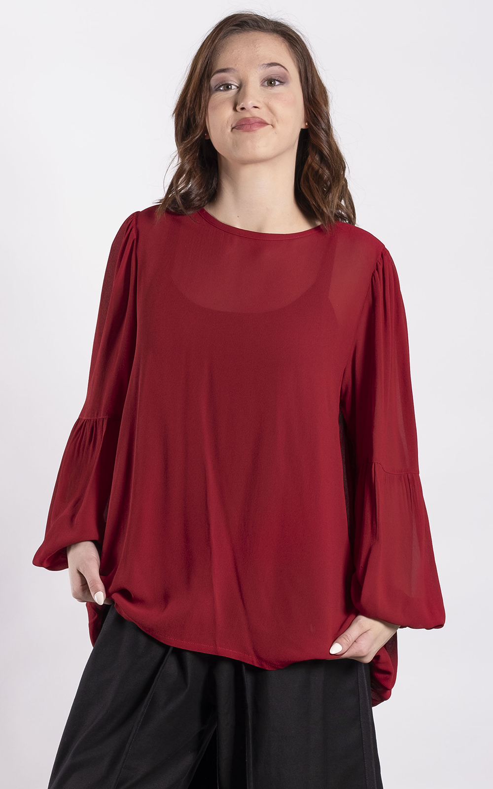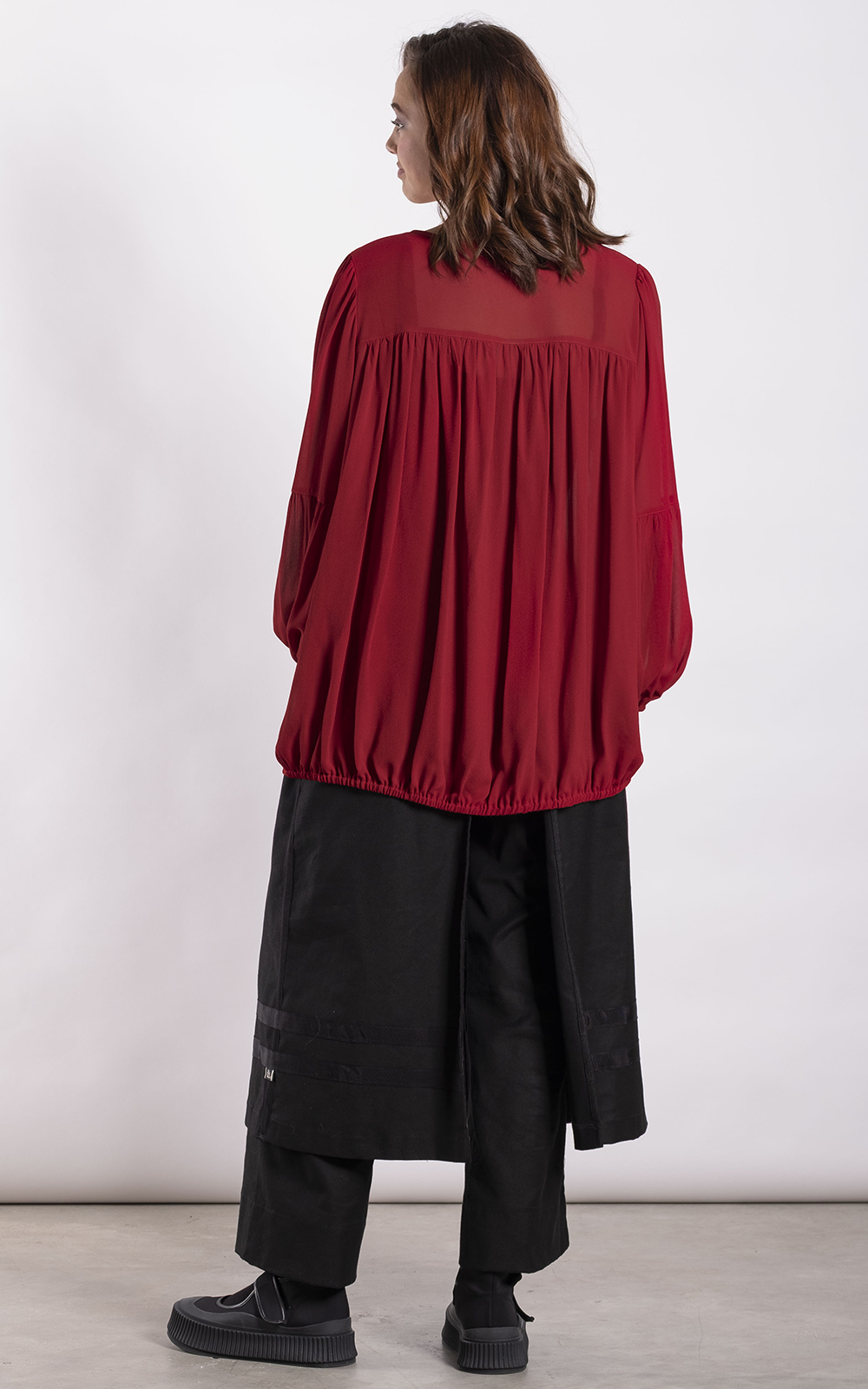 The Stella Top is an easy-wear women’s style with a relaxed silhouette and soft shaping. Featuring a clean front, long sleeves, and an elasticated gathered back hem, it adds gentle shape and movement while remaining comfortable. Straight front hem and easy pull-on design make it effortless to wear and layer.