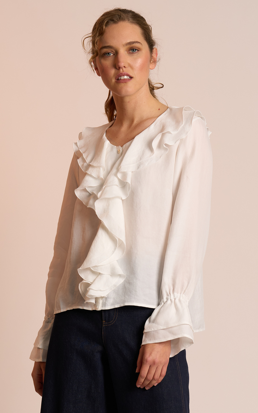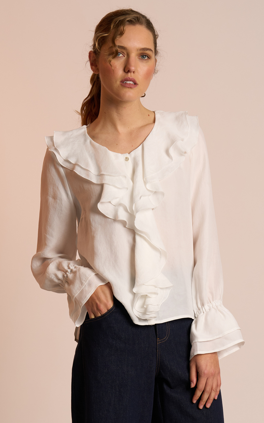 The Stevie Blouse by Neris channels romantic 70s nostalgia with its beautifully floaty silhouette. Crafted from 100% cupro, the fabric is exceptionally soft with a luxurious winter weight. The blouse features a frilled collar that buttons down the front and elasticated cuffs for ease and elegance. Elevate your everyday style with this timeless, feminine piece.