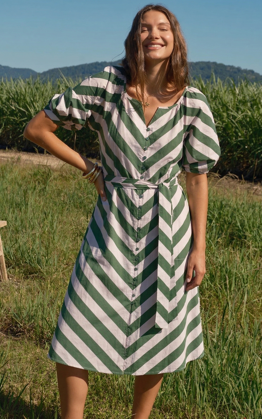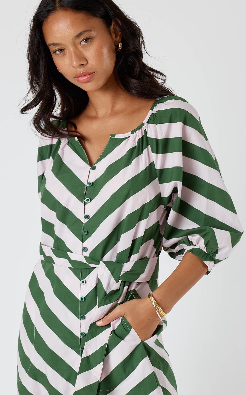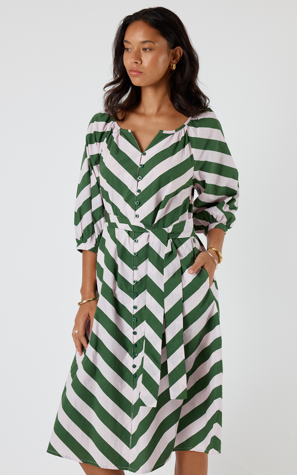 The Stripe Button Dress by Itami is a breezy midi crafted from lightweight cotton in an olive green and off-white stripe. A split scoop neck and neat front button closures with an internal tap to keep things secure without any gaping, while side seam pockets and softly puffed half sleeves with elastic cuffs add effortless charm. A removable waist tie lets you tailor the fit exactly how you like, making it as relaxed or defined as your day calls for.