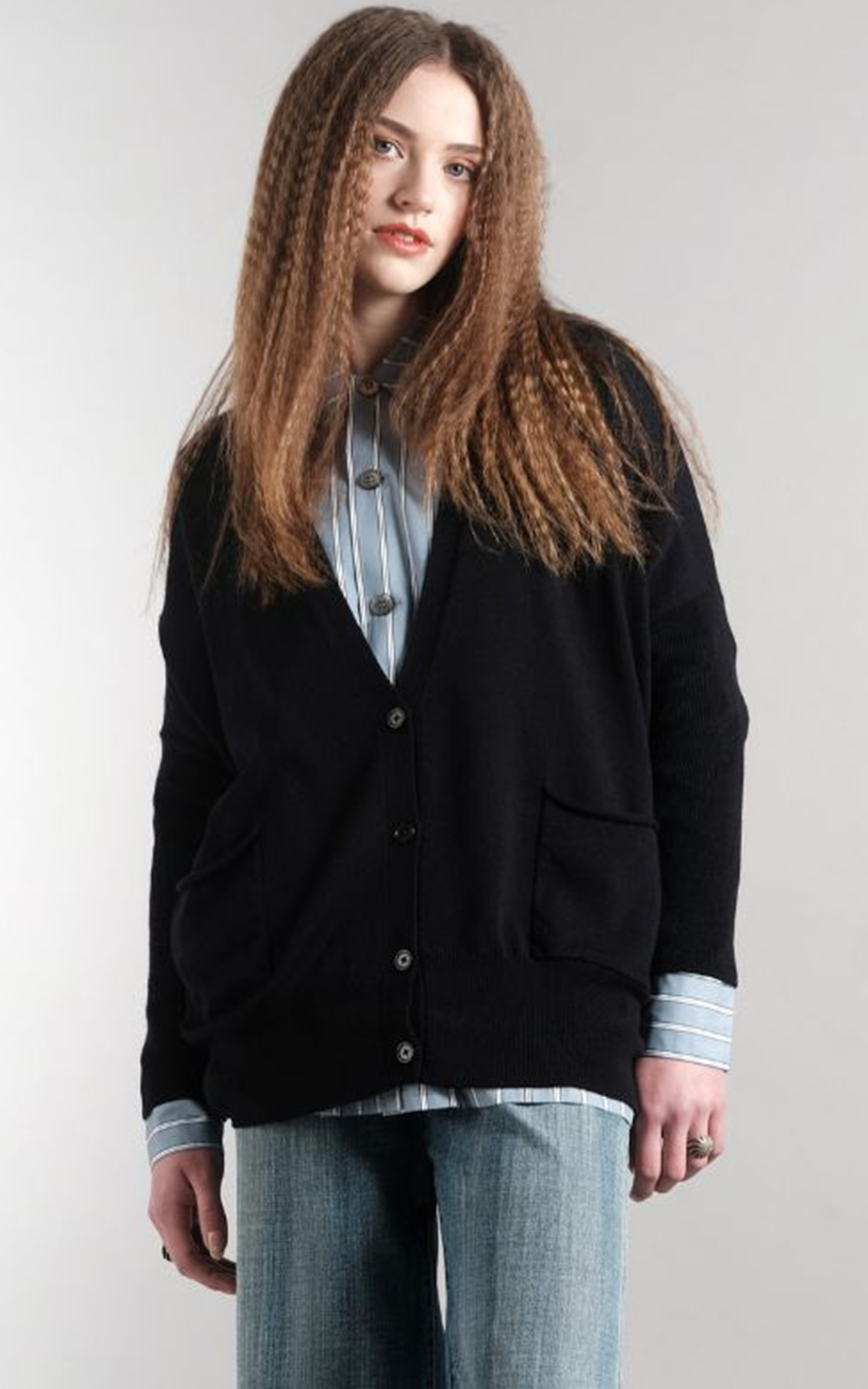 The Strung Out Cardi by Nineteen 46 is made from the softest merino. It features a deep V neckline with a front button closure, dropped shoulders with fitted ribbed sleeves, a central back seam, and two front patch pockets. Finishing below the hip, this relaxed cardi is perfect to throw on over a merino or tee for the weekend or dress up for a day at the office.