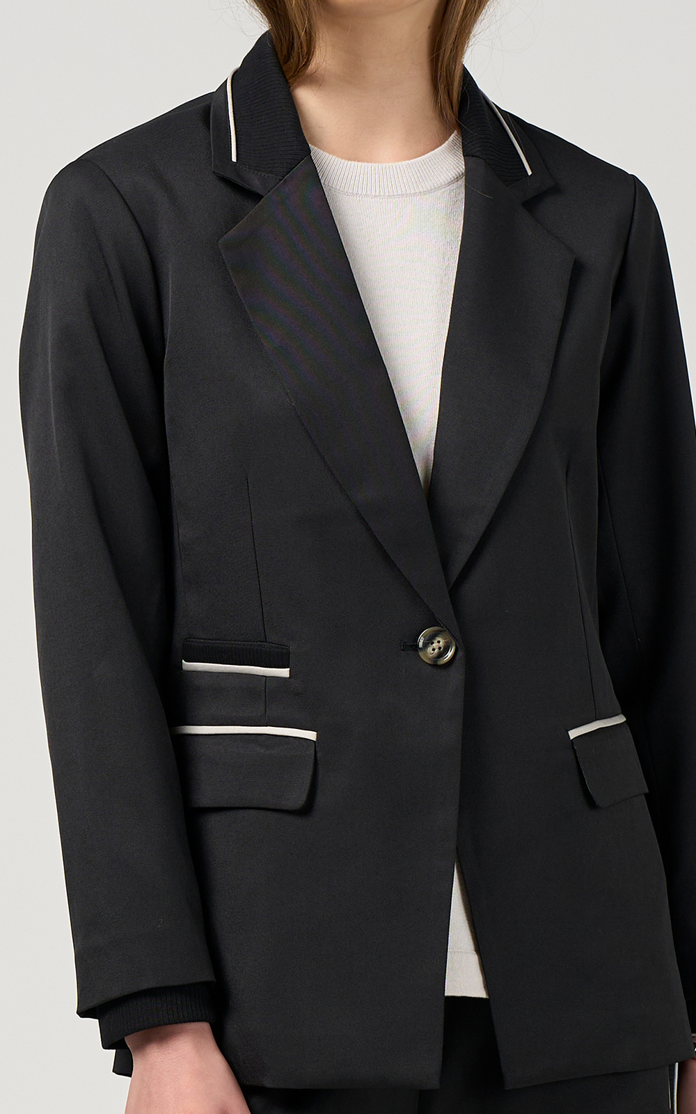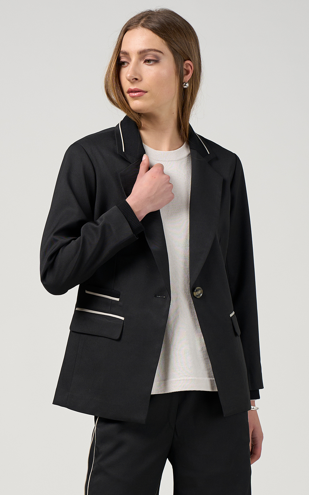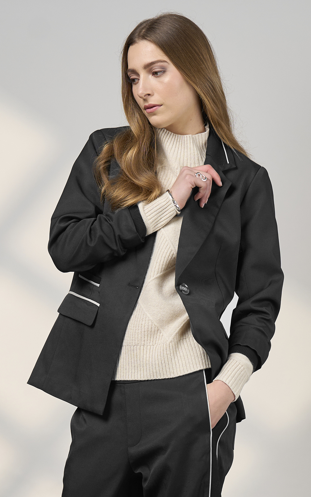 Relaxed tailored jacket featuring rib insert panels at collar, center back, pockets and internal cuffs, with fine contrast insert piping and functional pockets. Fully lined.