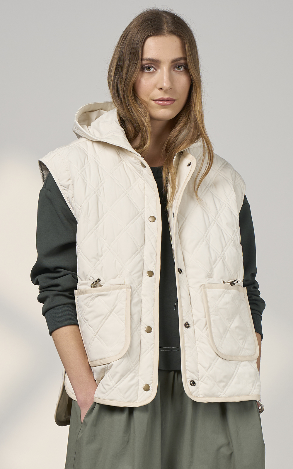 Multi functional jacket with front patch pockets, and removeable sleeves and hood – very versatile giving the wearer 4 ways to wear. Fully lined.