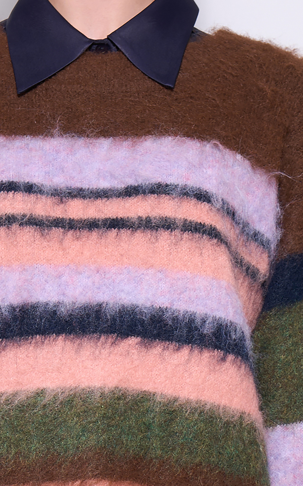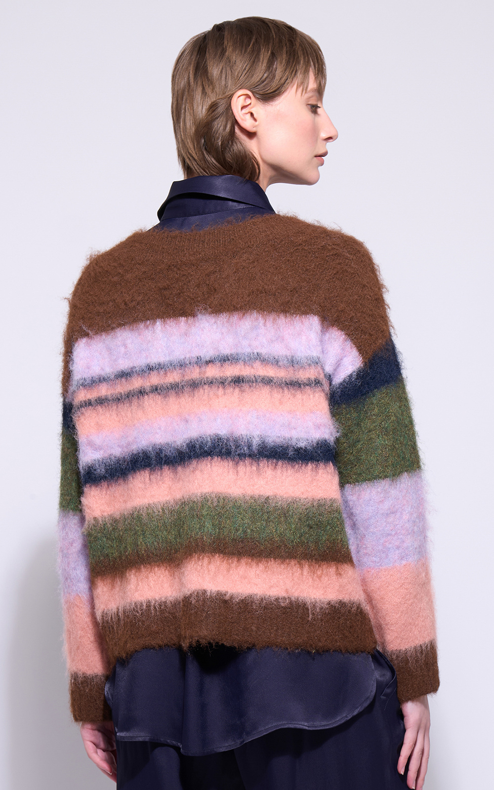 The Muse Jumper by Neris is a cozy wool-blend jumper featuring a fluffy mohair-style fabrication and chunky block stripes. With its relaxed fit, it’s perfect for layering over casual outfits to keep warm and stylish during colder months. Designed in Christchurch, New Zealand.