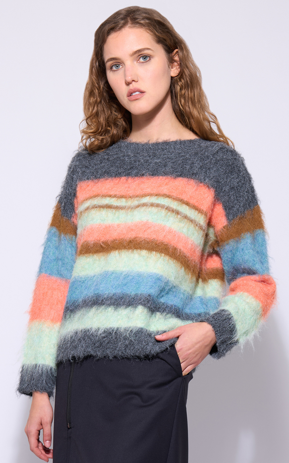 The Muse Jumper by Neris is a cozy wool-blend jumper featuring a fluffy mohair-style fabrication and chunky block stripes. With its relaxed fit, it’s perfect for layering over casual outfits to keep warm and stylish during colder months. Designed in Christchurch, New Zealand.