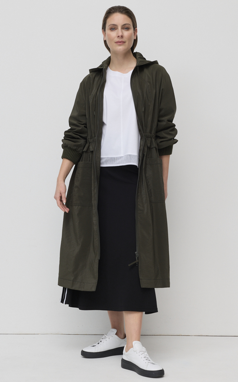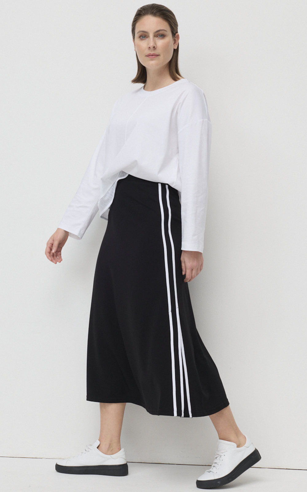 Expertly crafted from a silky viscose blend, the Twin Stripe Ponte Skirt embodies a contemporary take on the classic midi skirt. Style it effortlessly with a casual tee, or dress up for the office with a blazer. Your go-to piece for effortlessly transitioning from work to the weekend.